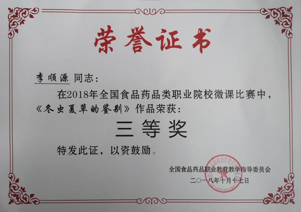 11-09-2018药学与检验学院教师荣获全国食品药品行指委微课比赛三等奖