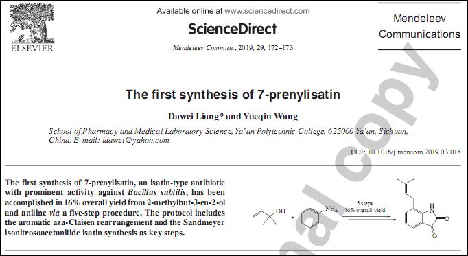 近日,我院梁大伟老师在天然活性分子合成研究方面取得新进展,相关成果以题“The first synthesis of 7-prenylisatin”发表于SCI刊物《Mendeleev Communications》(Mendeleev Commun., 2019, 29, 172–173. DOI: 10...