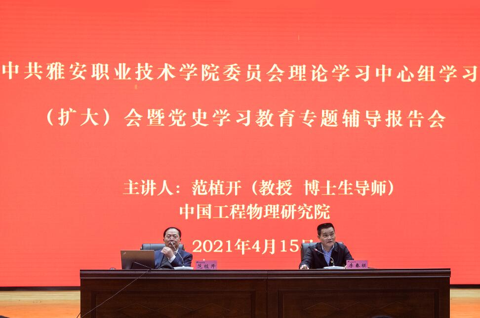 4月15日,学院党委理论中心组学习(扩大)会暨党史学习教育专题辅导报告会在经开区校区聚雅厅举行,中国工程物理研究院培训中心主任范植开教授作专题辅导报告,学院党委书记李春模主持报告会。 范植开以《弘扬“两弹...