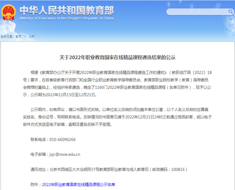 12月15日,根据《教育部办公厅关于开展2022年职业教育国家在线精品课程遴选工作的通知》(教职成厅函〔2022〕18号)要求,在各省级教育行政部门和全国行业职业教育教学指导委员会、教育部职业院校教学(教育)指导委员会推荐的基础上,经组织专家遴选,确定了1160门2022年职业教育国家在线精品课程,学院《基本护理技术》《妇产科护理》入选职业教育国家在线精品课程遴选结果公示名单。《妇产科护理》2015年建成省级精品资源共...