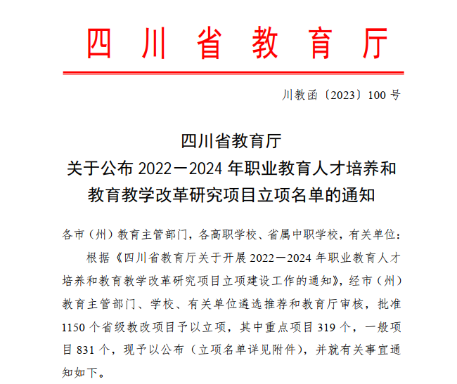 04-13-2023学院获批19个四川省教育厅2022-2024年职业教育人才培养和教育教学改革研究项目