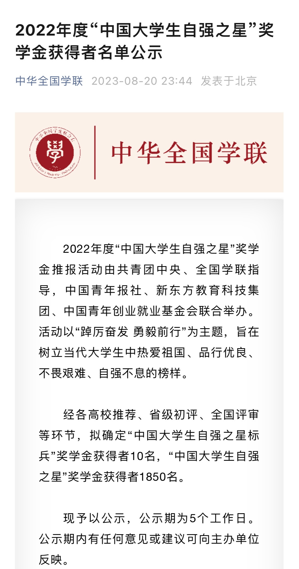 08-21-2023学院2名学生荣获2022年度“中国大学生自强之星”奖学金