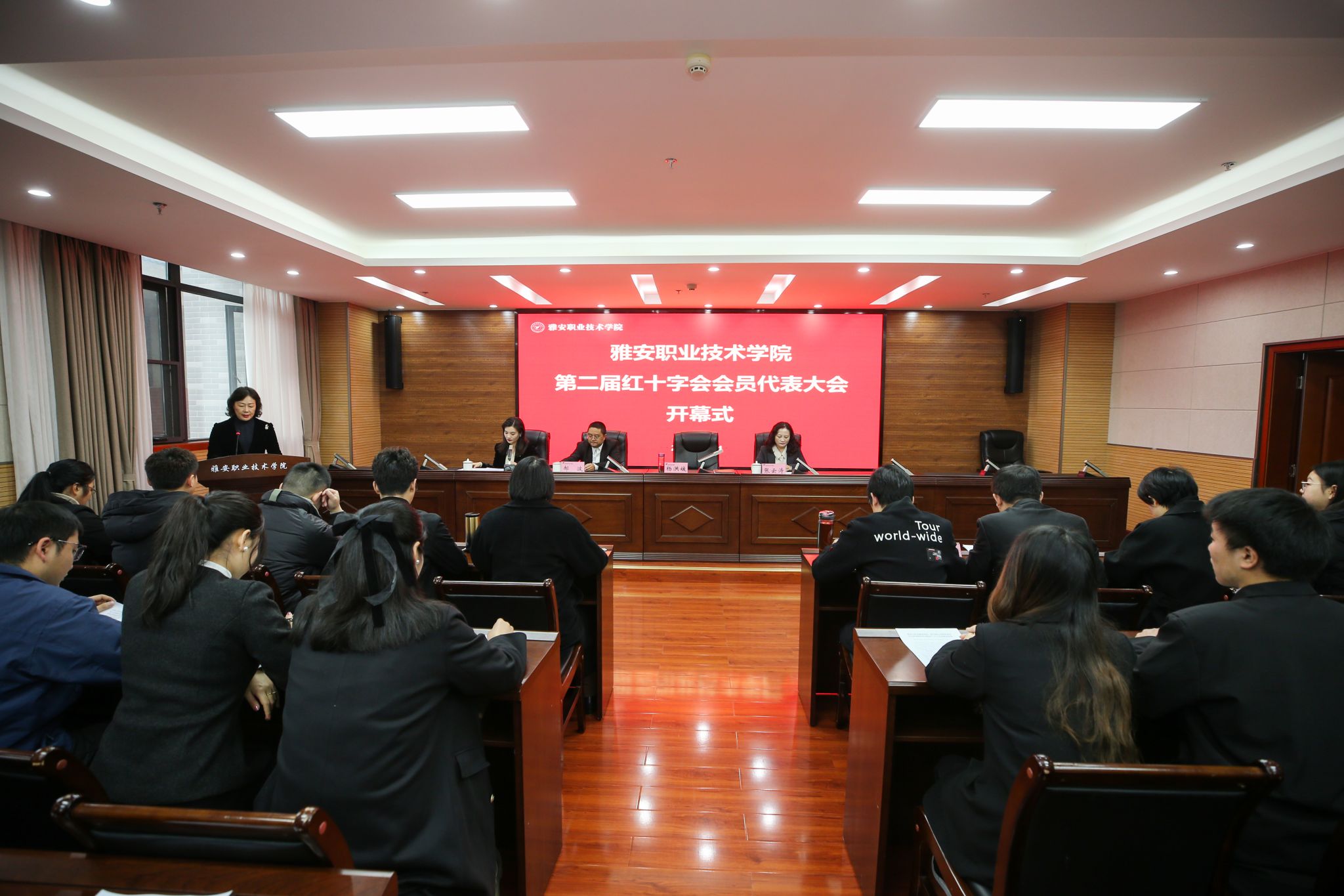 11月24日,学院第二届红十字会会员代表大会在经开区校区综合楼311召开。学院党委委员、纪委书记杨洪媛,雅安市红十字会党组书记、常务副会长张云涛,雅安市红十字会秘书长郝波,党政办、学生处、团委、工会相关负责人及各二级学院会员代表86人参加。大会在庄严的《国歌》声中正式开幕,杨洪媛致辞。她指出,召开红十字会会员大会是学院老师、同学们共同关心的一件大事,也是学院社会公益事业发展的一件要事,希望各位代表以主人...