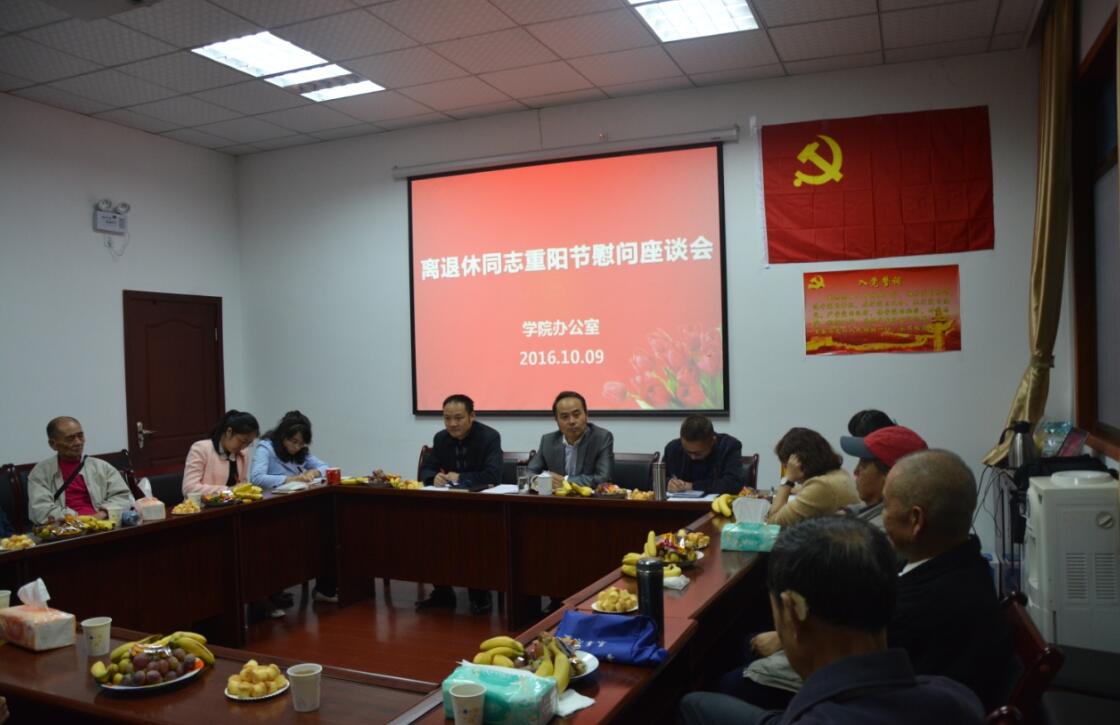 【本网讯】10月9日下午,党政办公室在育才路校区B210会议室召开离退休同志重阳节座谈会,对离退休老同志进行慰问。党委书记张大凯,副院长樊先茂,办公室副主任江成鹏、王悦秋,图书馆副馆长文艺及10名离退休老干部代...