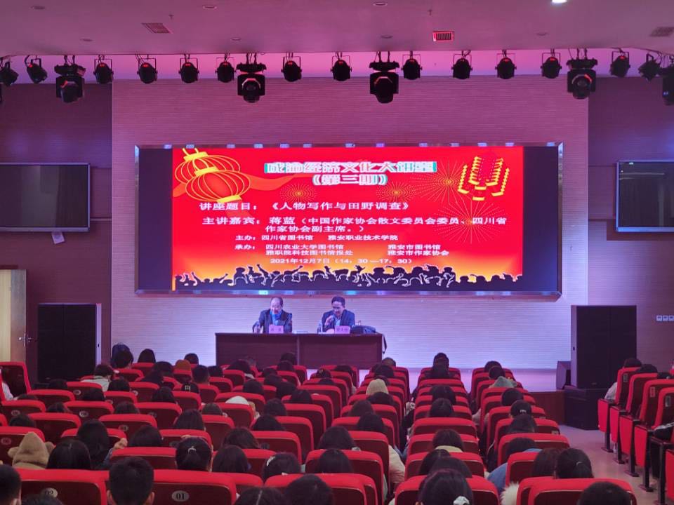 12月7日下午,由四川省图书馆、PP电子游戏网站主办的“成渝经济文化大讲堂”第三期在学院青年路校区汇雅厅举行。讲座由中国作家协会散文委员会委员、四川省作家协会副主席蒋蓝先生主讲,雅安市图书馆、雅安市作家协...
