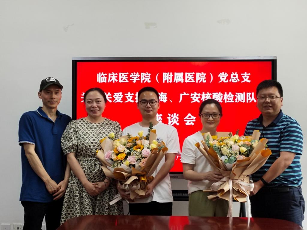 花开半夏,英雄归来。6月16日,临床医学院(附属医院)党总支在育才路校区办公楼B210召开了关心关爱支援上海、广安领水核酸检测队员座谈会,欢迎支援上海、邻水疫情防控的左文科、张明艳两位同志平安回家。临床医学院...