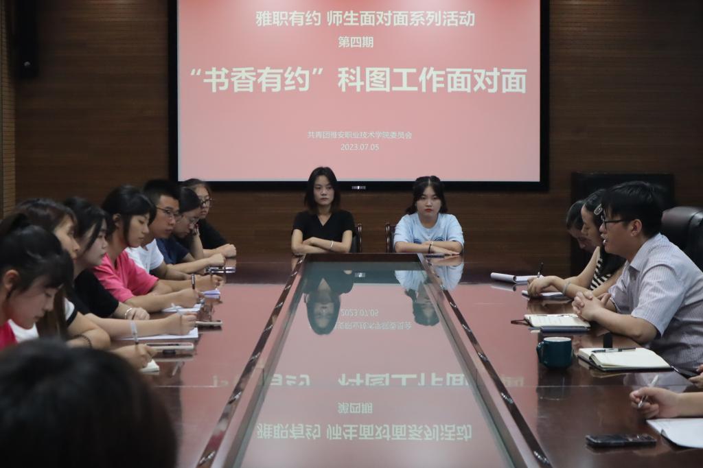 7月5日,“雅职有约 师生面对面”系列活动第四期在经开区校区综合楼303会议室开展。本次活动主题为“书香有约—科图工作面对面”。科技图书情报处、团委相关负责人、学生代表40余人参加座谈会。会上,科技图书情报处副处长肖可围绕科研论文、课题申报、图书馆时间管理、图书资源、阅读活动、阅览室公共卫生等方面进行了介绍,学生代表结合自身实际情况就科图工作相关问题进行咨询,与会老师认真听取同学们的发言并详细记录,就...