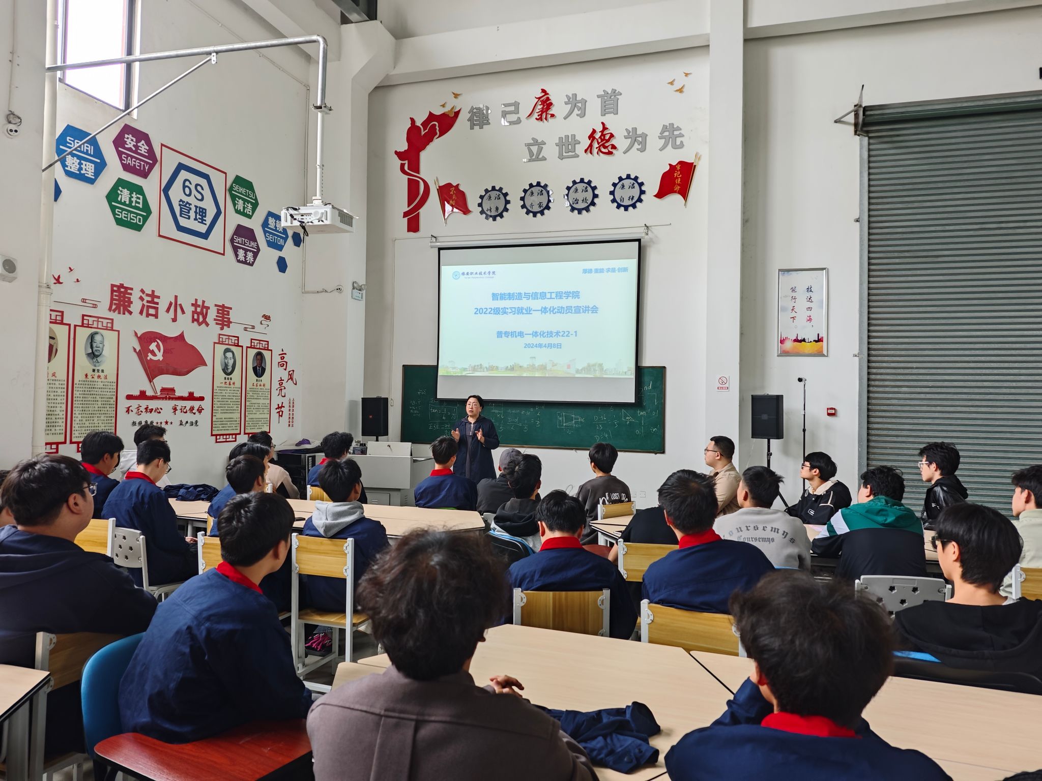 为促进岗位实习规范有序开展,积极推动岗位实习与就业工作的深度融合,4月8日—4月12日智能制造与信息工程学院以班级为单位,召开了2022级实习就业一体化动员大会。智能制造与信息工程学院精心筹备动员会,二级学院党政班子、全体专业负责人、辅导员、骨干教师集体研究,制定内容丰富的宣讲提纲,从岗位实习特点、认识就业形势、角色认知转换、严守实习纪律、注意安全防范等方面给学生进行针对性指导,旨在帮助他们明确实习要求...