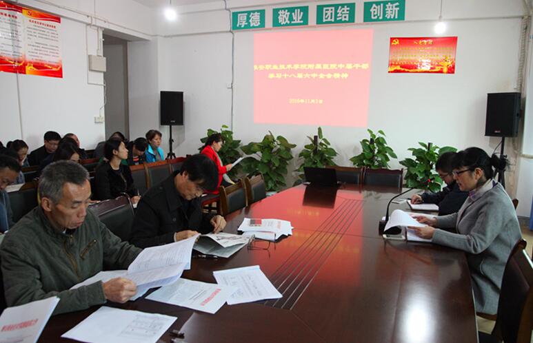 【本网讯】11月3日下午,附属医院党支部在行政楼301会议室组织党员及中层干部传达学习党的十八届六中全会精神,会议由党支部书记祝继英主持,副院长何跃、支部委员、部分党员及中层干部共计47人参加学习会。 在集...