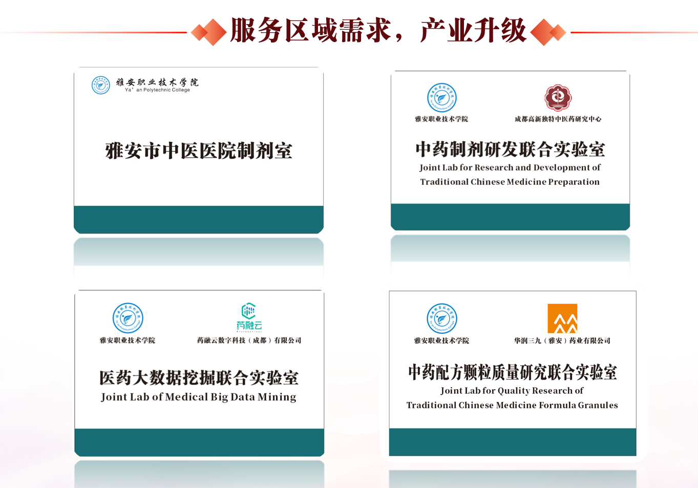 中心紧扣食品、医药、大健康产业发展,现已与义兴藏茶、汉源县新纪调味食品厂、华润三九(雅安)药业有限公司、雅安市中医医院、成都高新独特中医药研究中心、药融云数字科技(成都)有限公司等深化产教融合、校企合作。依托雅安特色农产品和雅药资源,发挥学院科研团队、实训资源和综合性院校多学科优势,跨学科组建“众创空间”,全方位服务雅安食品药品产业。