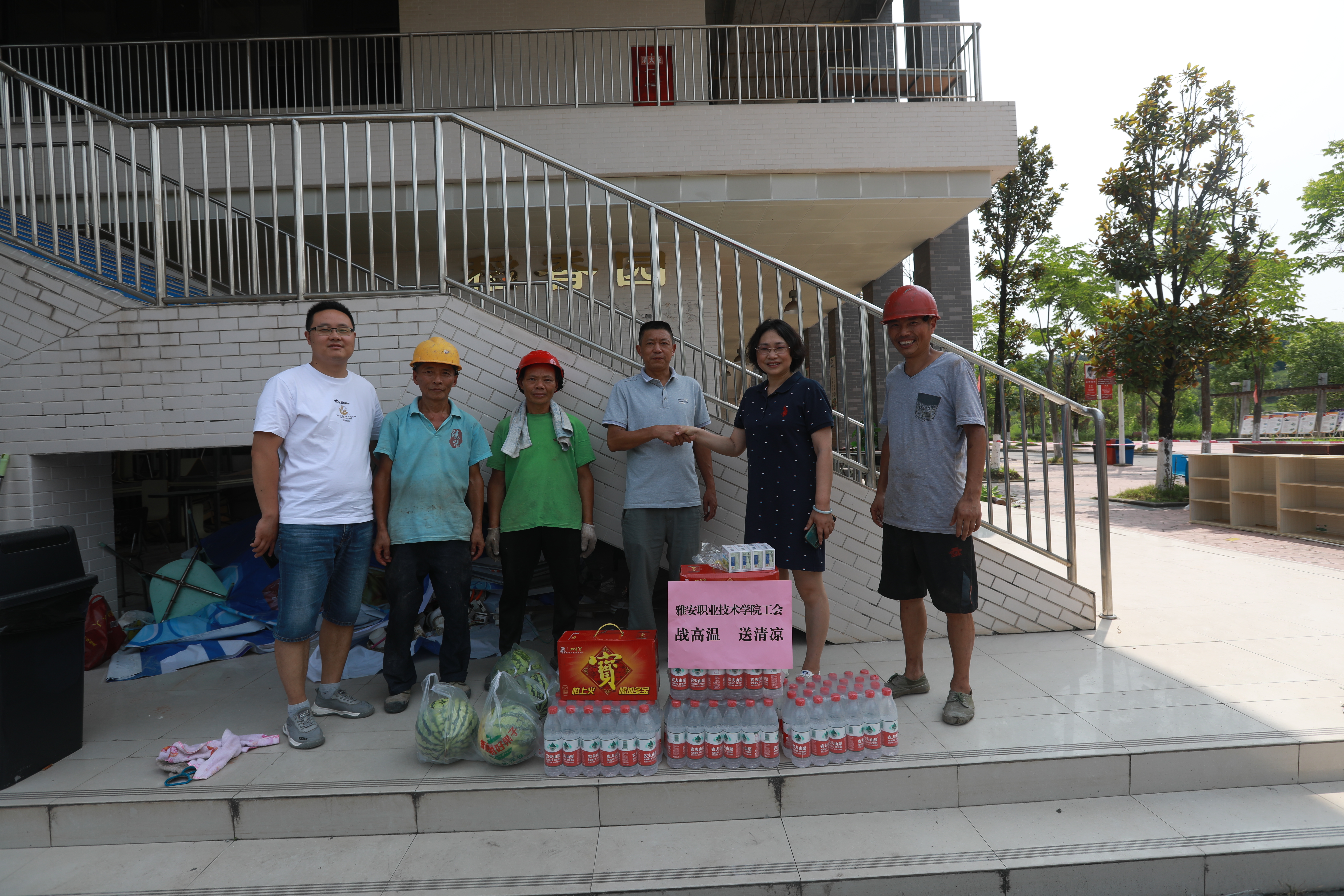 夏安琼、张军一行带着学院党政领导班子的嘱托,先后到青年路、经开区校区看望了保安和保洁人员,并走进办公楼各处室、建筑工地,为辛勤奋战在岗位上的教职工及后勤服务人员送上饮品、水果和防暑药品。夏安琼、张军充分肯定了工作人员认真、负责的工作态度,对同志们冒着高温酷暑坚守岗位,为学院安全稳定发展做出的努力表示感谢,并要求相关企业切实履行疫情防控和防暑降温工作主体责任,积极改善劳动条件和工作环境,扎实做好劳动保护宣传教育。同时,还嘱咐大家强化安全意识,确保安全生产。