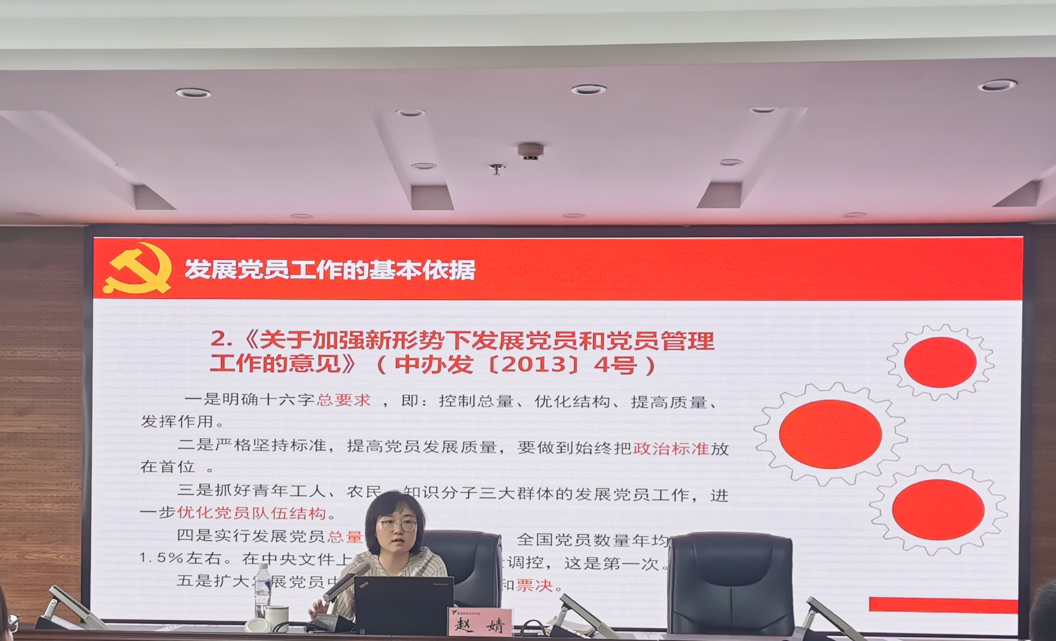 雅安市委组织部组织一科科长赵婧以《高校发展党员工作交流》为题,围绕发展党员工作基本依据、主要流程和违规违纪排查整顿三方面进行讲解,重点对发展党员“五个阶段二十五个步骤”做了详细解读,在关键和易错环节采用案例法予以说明。培训过程中,赵婧同志还对高校党支部规范化建设提出指导性建议。