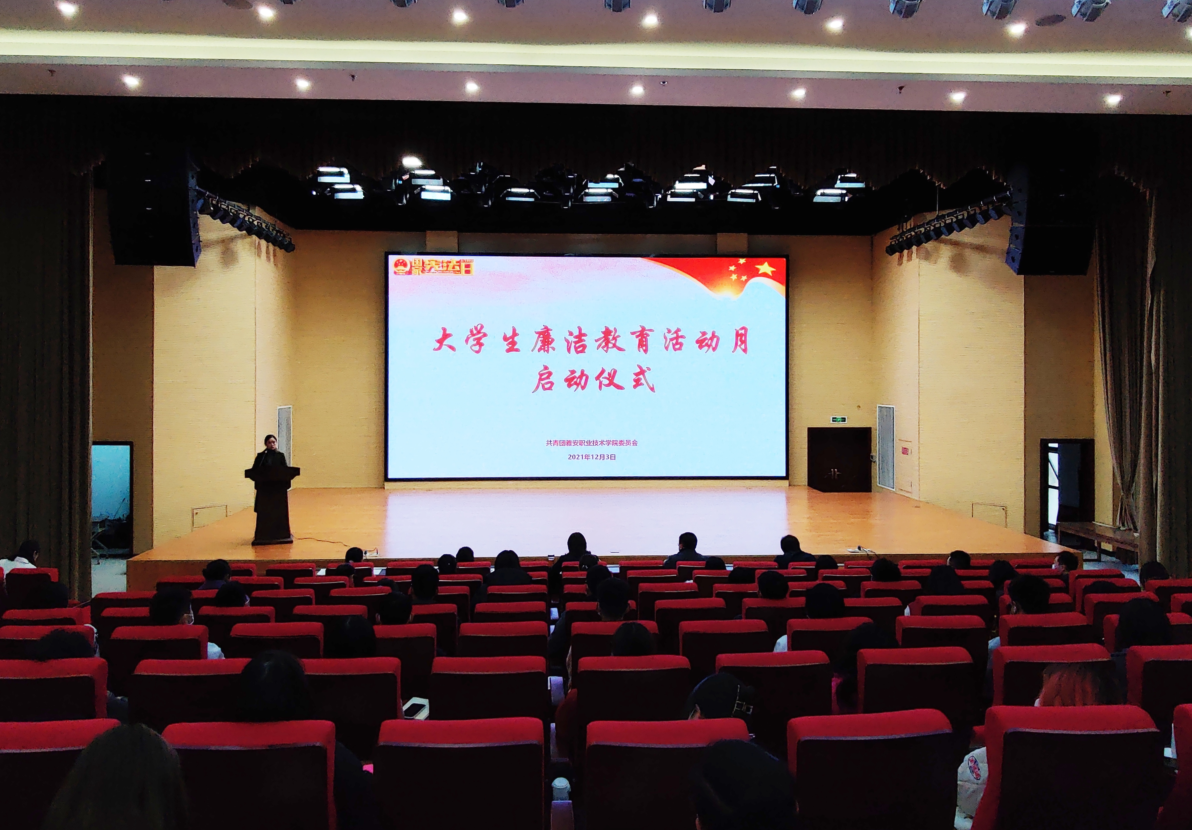 为认真贯彻落实习近平法治思想,大力弘扬宪法精神,深入开展大学生廉洁教育,12月3日,院团委、纪检监审处及学生处联合开展“宪法宣传周”暨“大学生廉洁教育活动月”启动仪式。活动在经开区校区聚雅厅举行,学院党委委员、纪委书记杨洪媛出席启动仪式并讲话,院团委、学生处及各二级学院负责人、学生代表90余人参与活动。