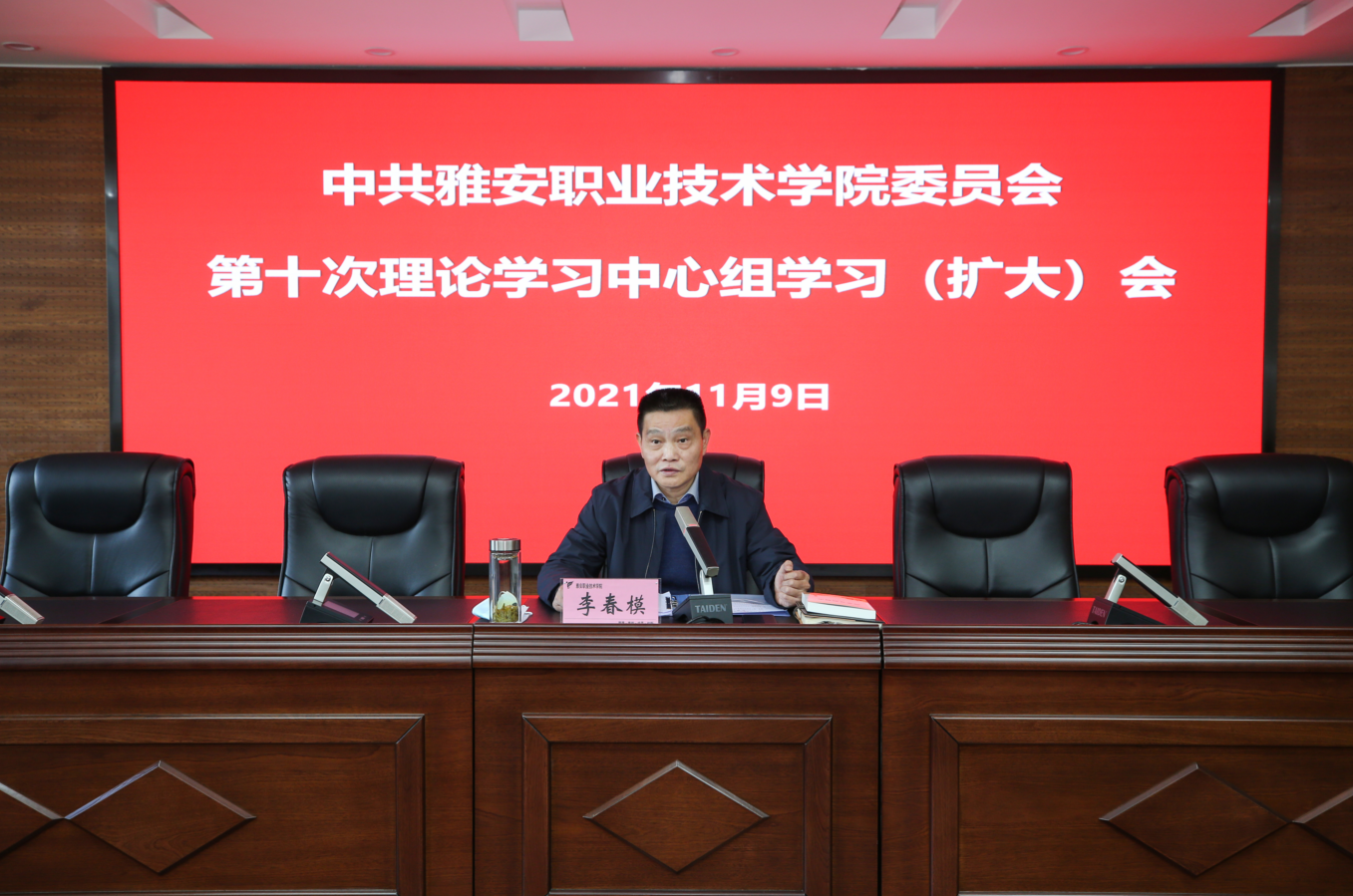 11月9日下午,学院2021年第十次党委理论学习中心组学习(扩大)会在经开校区综合楼311会议室召开。学院党委中心组成员、党政班子成员、中层干部共计79人参会。会议由学院党委书记李春模主持。