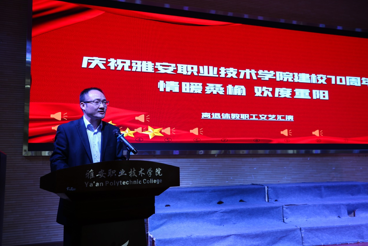 尊老敬老,传承美德。在第九个“老年节”暨重阳节来临之际,结合建校70周年庆祝活动,10月13日上午,离退休工作处组织了以“情暖桑榆 欢度重阳”为主题的庆祝活动,离退休教职工相聚在学院青年路校区,共庆建校70周年,共度重阳佳节。学院党委委员、副院长樊先茂,工会主席夏安琼,党委委员、组织部部长、人事处处长刘永恩,各二级单位中层干部和学生代表共计150人参加了本次活动。