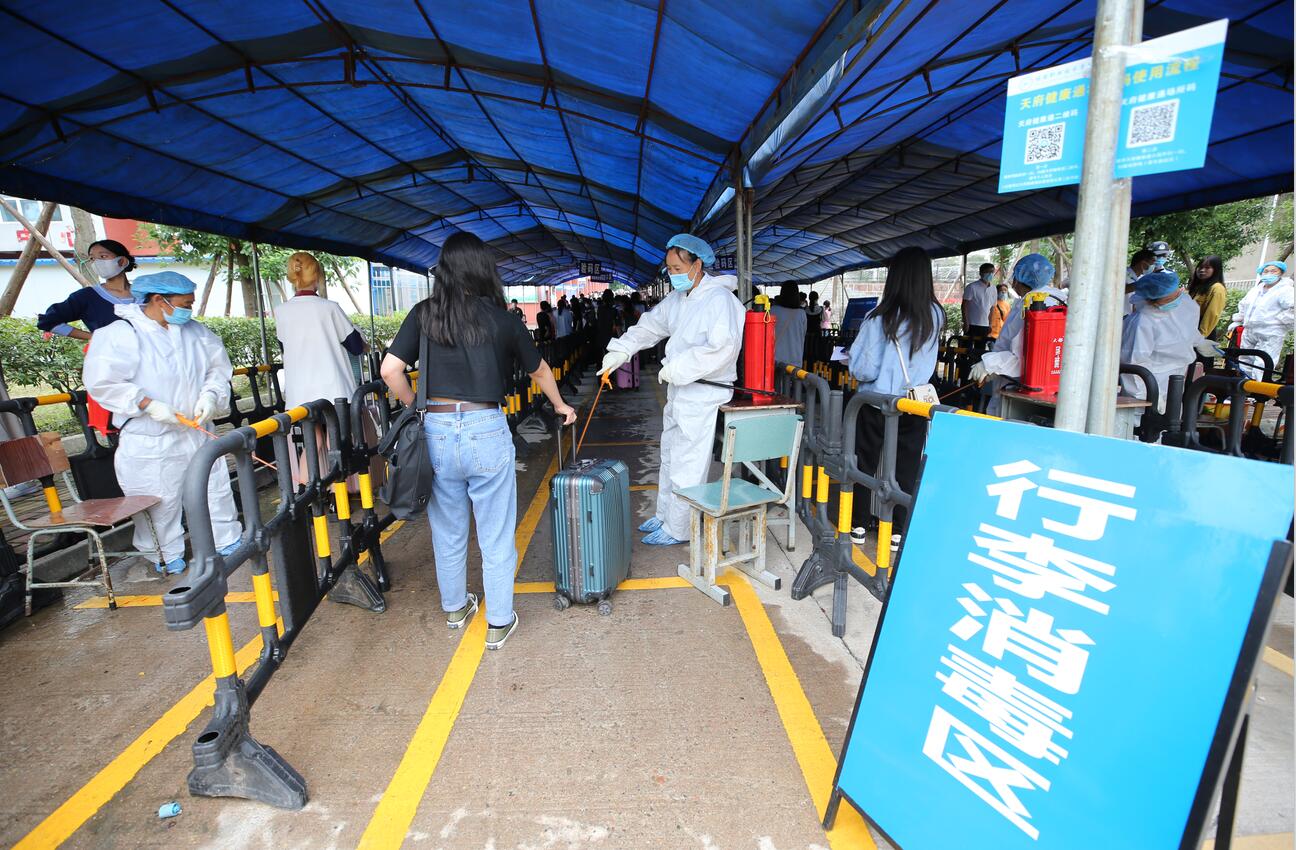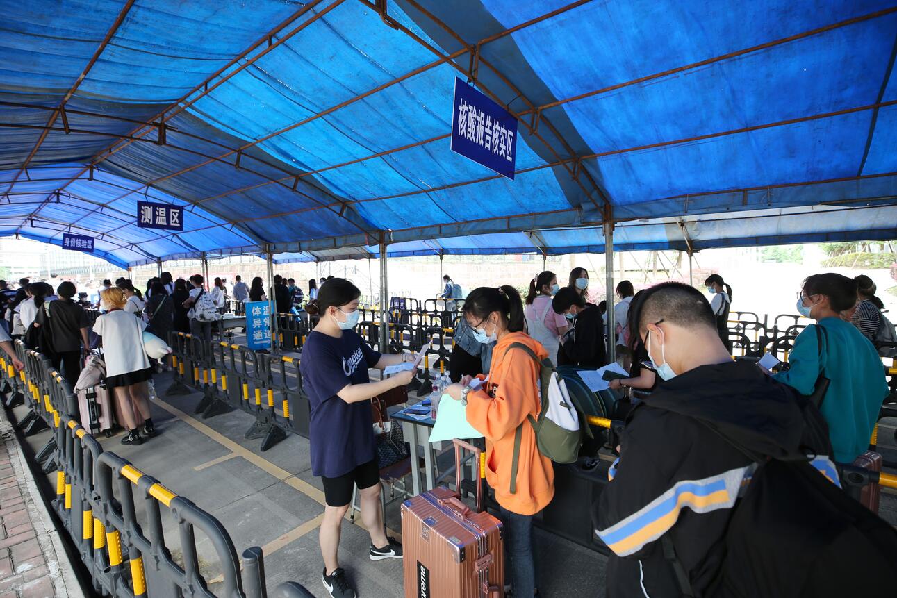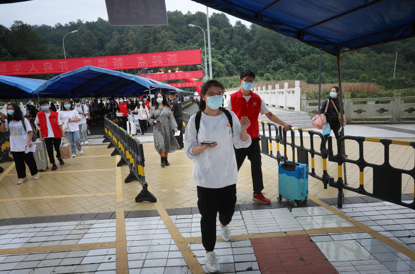 早上8:00,各相关部门和二级学院工作人员带着期待和喜悦,早早地守候在迎新现场,迎接新生们的到来。大家盯靠一线,紧密配合、热情服务、协作有序。2021级新同学戴着口罩,沿着醒目的地面标识排队等候,依次进行行李消毒、查验健康码、核实核酸检测报告、体温检测、验证身份、报到注册等。院团委、各二级学院在迎新现场内外安排了数十名学生志愿者,他们以暖心的笑容与热情的服务帮助同学们一趟趟搬运行李,引导他们有序排队,各项工作秩序井然。