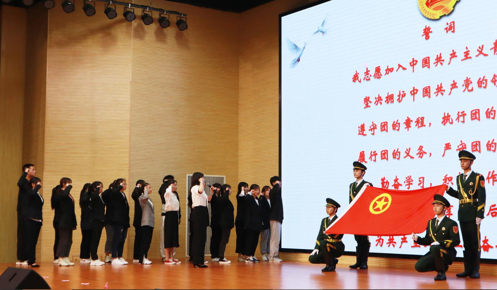 会议为40名新团员举行了庄严的入团仪式,杨洪媛宣读《关于批准张世博奥等40名同学加入中国共产主义青年团的决定》,参会领导为新团员佩带团徽,国旗护卫队出团旗,新团员入团宣誓,老团员重温入团誓词。樊先茂宣读《关于表扬2020—2021学年度五四红旗团总支、先进团支部、优秀团干部、优秀团员等的决定》,并向获奖代表颁发荣誉证书和奖牌。