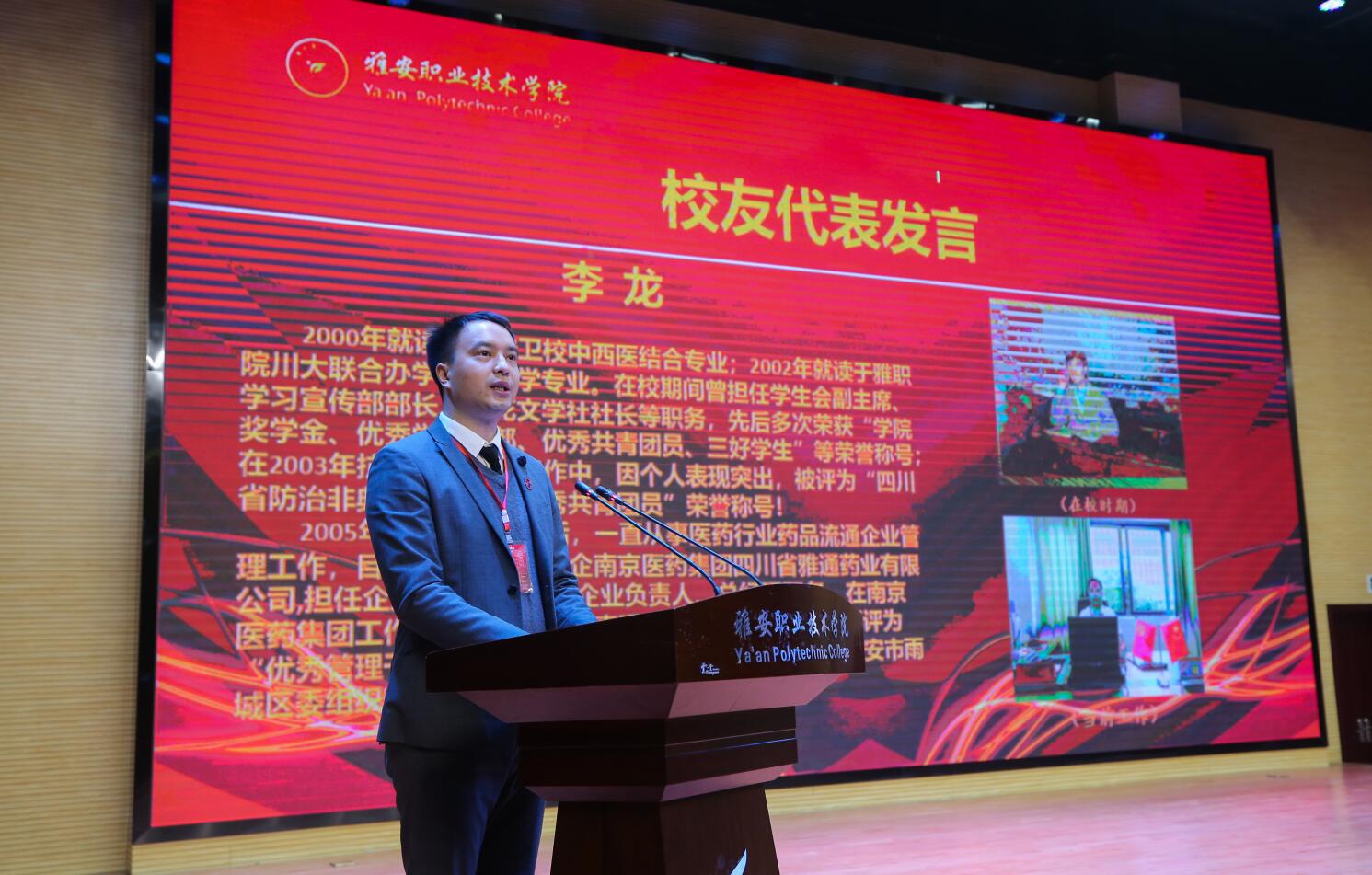 校友会第一届理事会常务副会长、南京医药集团四川省雅通药业有限公司党支部书记、总经理李龙代表理事会成员发言,他表达了对母校培育的感激之情以及对母校发展成绩的自豪之情,并号召全体校友加强联系,热切关心与支持母校的发展,为学院和社会做出更大贡献。