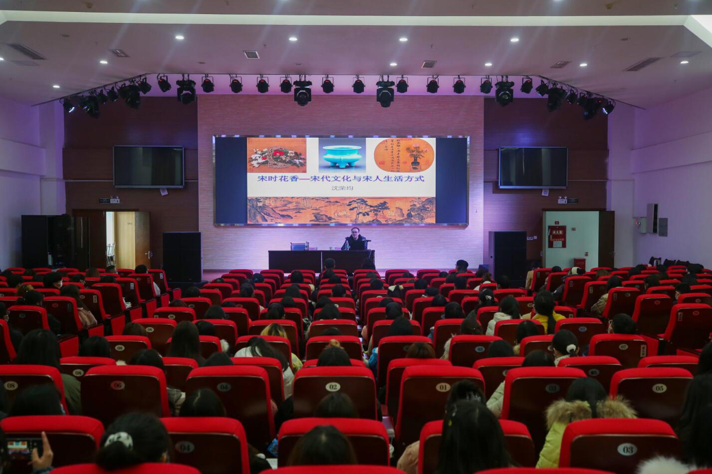 沈荣均先生分别以“看上去很美”、“花声里”、“幸福的生动之始”、“抵达晨曦和黄昏”、“手工的精神”等为主题,系统讲述了宋都繁华、词茶花香、宋瓷艺术以及宋人自由而奔放的精神世界,并带领大家一起领略了李清照清新婉约的词风、苏轼豪放劲迈的词风以及张择端《清明上河图》的细腻和宏伟,为师生呈现了一幅充满自信和创造力的宋代文化画卷,使广大师生对宋代文化和宋人生活有了进一步的了解,激发了大家对历史和传统的崇敬。讲座语言生动,内容丰富,赢得现场师生热烈的掌声。