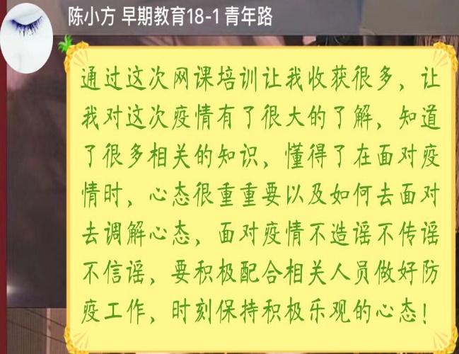 面对疫情,学生可能会遇到各种心理挑战,心理中心积极发挥朋辈支持力量,对全院各班级心理委员开展了网上培训,普及心理辅导与支持常识。同学们积极响应,认真学习,纷纷表示,新冠肺炎疫情防控心理知识培训改变了他们的生活方式,也使他们获得了心理知识,减少了焦虑与失序,促进了成长。