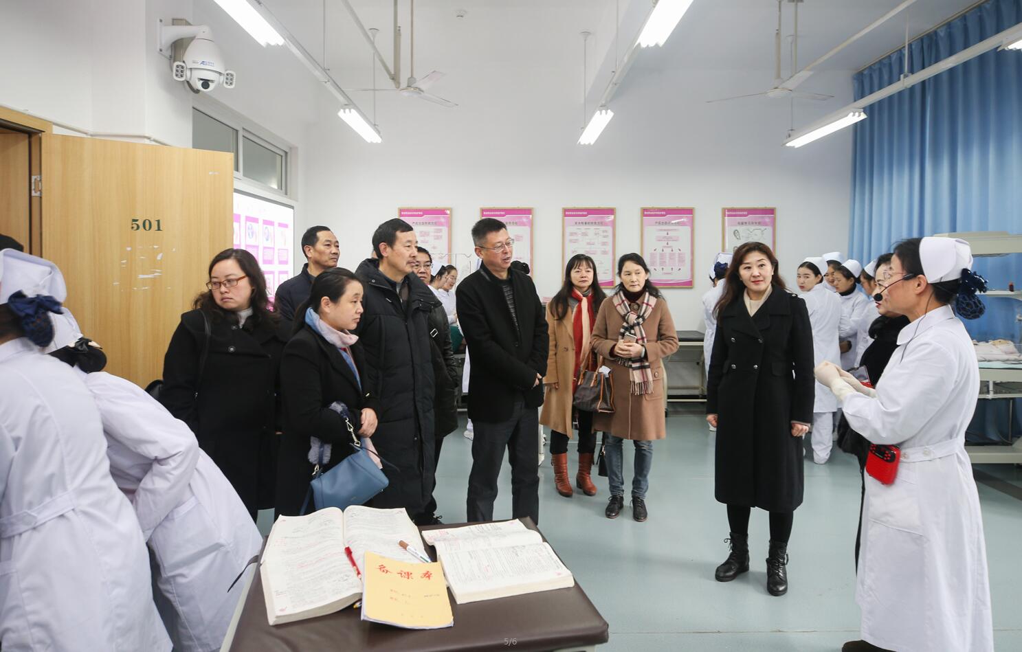 蔡军一行参观了学院附属医院体检中心、皮肤科,校史馆及智信学院、药检学院、护理学院的实训中心。