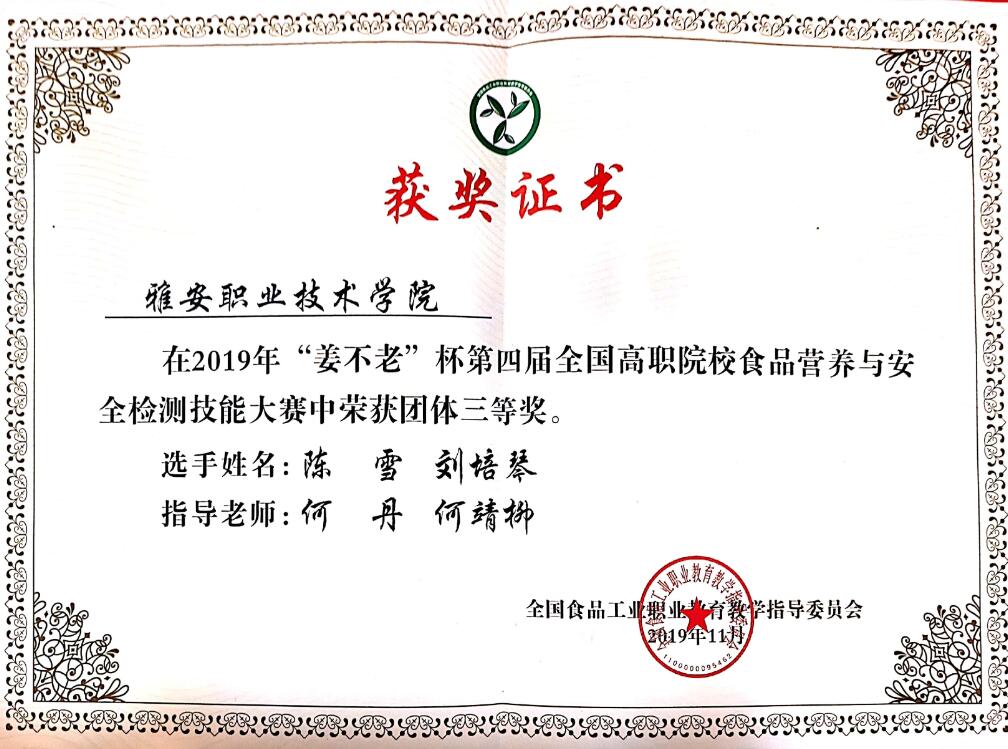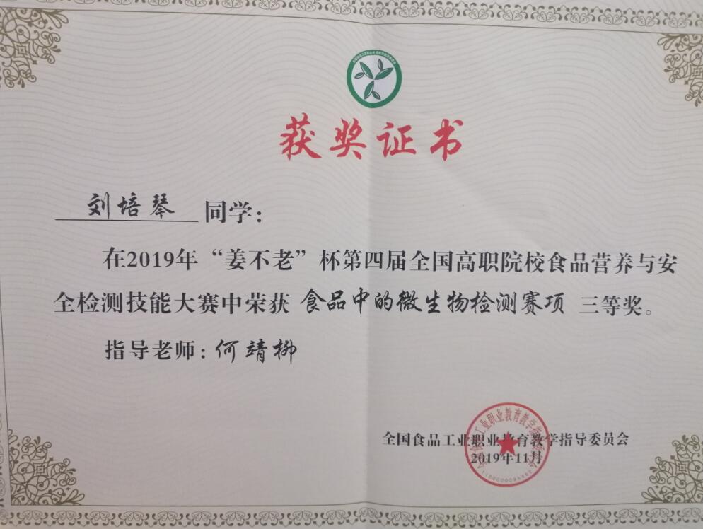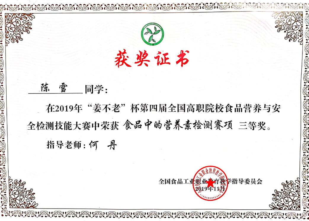 11月14日-17日,第四届全国高职院校食品营养与安全检测技能大赛由全国食品工业职业教育教学指导委员会主办,江苏农林职业技术学院承办,全国共83所院校,163名选手参加比赛。经过激烈角逐,药学与检验学院食品专业的两名学生分别获得“食品中营养素检测”赛项三等奖、“食品中的微生物检测”赛项三等奖和团体三等奖的优异成绩。