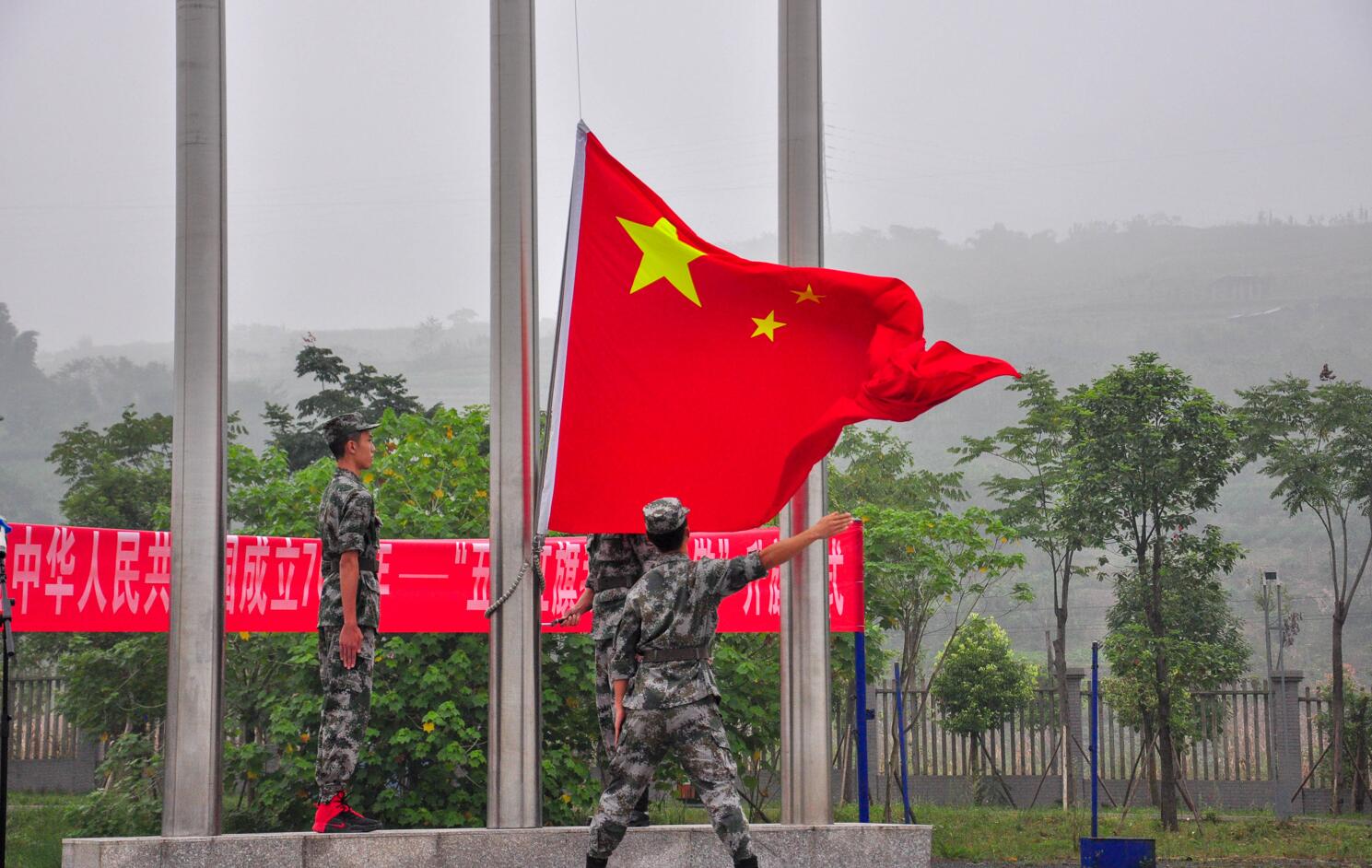在全体师生的注目下,升旗手身着绿色军装,迈着整齐的步伐、昂首挺胸地护送着五星红旗缓缓进场。随着庄严的国歌响起,升旗手振臂一挥,鲜艳的五星红旗迎风展开,随着音乐冉冉升起。在场的师生们行着庄严的注目礼,面容肃穆,内心翻涌,专注的眼神里满含着对祖国无限的热爱与崇高的敬意。伴着金秋明媚的阳光,迎着十月的云淡气爽,有多少感动和荣光,梦想和辉煌,都凝聚在每一个中国人的心里,也烙印在新中国的里程碑上。