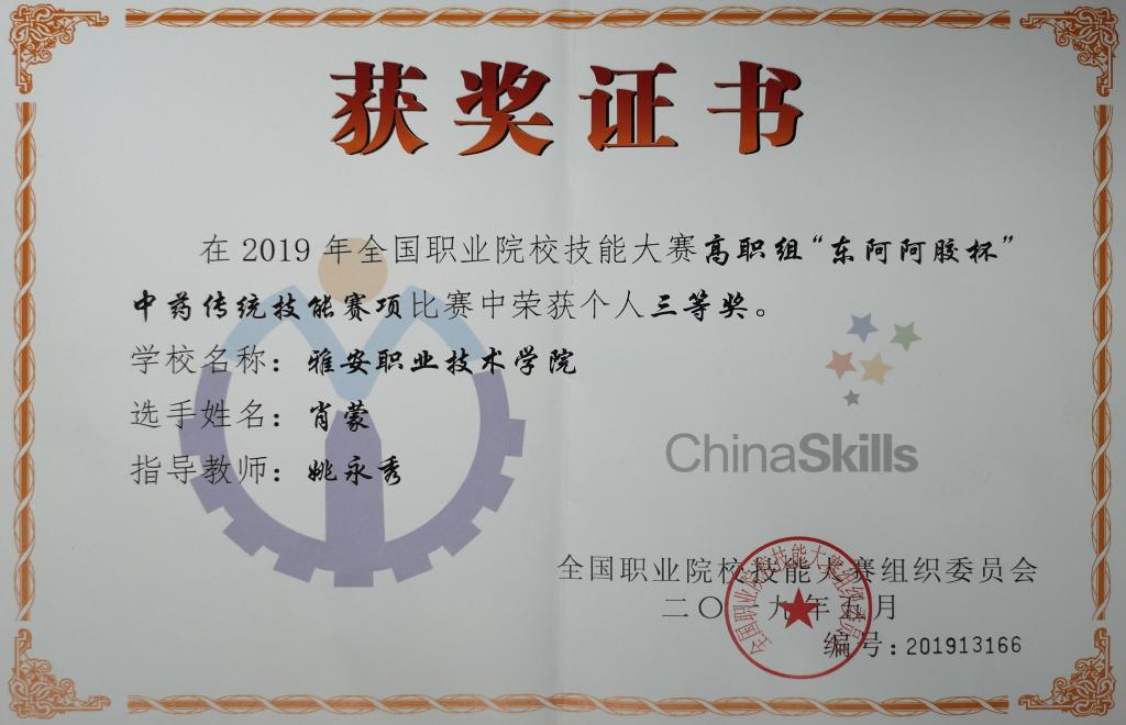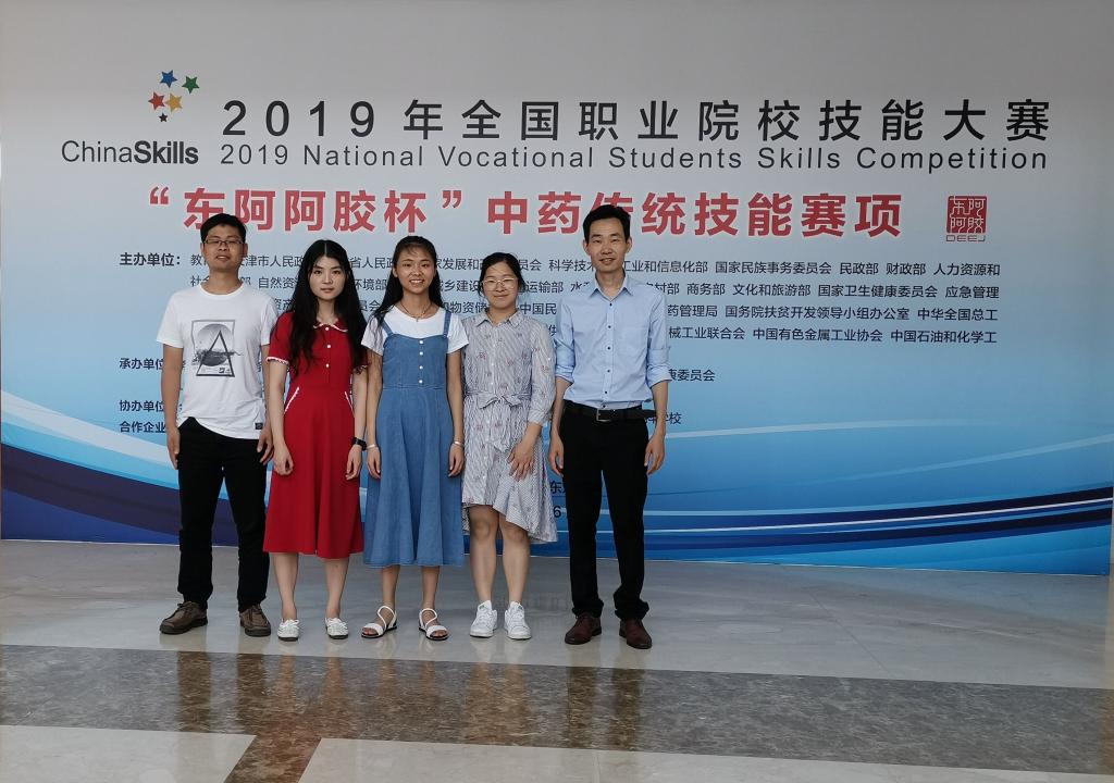 2019年全国职业院校技能大赛“东阿阿胶杯”中药传统技能大赛,于6月11日至6月15日在山东省中医药高等专科学校举行。大赛由教育部等部门主办,国家中医药管理局承办、山东中医药高等专科学校协办。本次大赛共有28个省市参赛代表队,77所学校,124名参赛选手参赛。彭灵芝、肖蒙两位同学代表四川省参加了本次比赛,经过两天的激烈比拼,肖蒙同学获得三等奖,这是学院获得的首个国家A类比赛奖项。