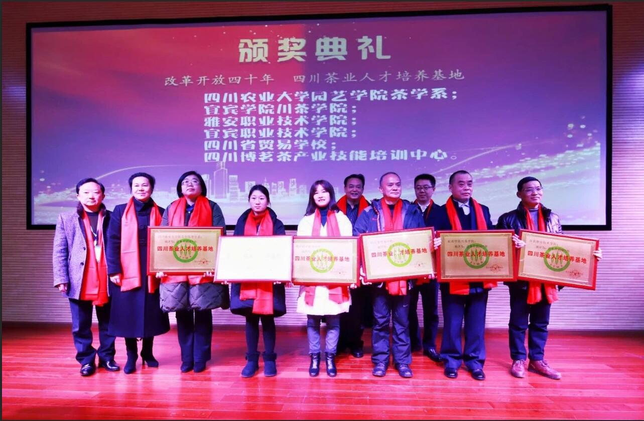 会上,学院党委书记李春模向到会的三百多位来宾表示热烈的欢迎,对学院的发展概况、茶叶类专业建设情况以及未来发展计划做了介绍,希望通过会议互通信息,启迪思想,促进四川茶产业和我院专业建设更好的发展。颁奖中,学院被授予“改革开放四十年,四川茶业人才培养基地”称号;经管学院茶叶类专业教师蒋丹荣获“改革开放四十年,四川茶业新锐人物”称号。