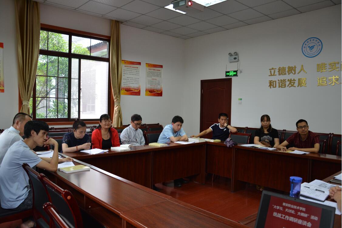 【本网讯】为落实学院“大学习、大讨论、大调研”活动要求,在前期梳理、分析基础上,宣传统战部确定了统战工作调研主题,7月9日下午,统战工作调研座谈会在育才路校区B210会议室召开。学院党委副书记付洪涛、宣传统战部负责人及民盟雅职院支部、民盟雅职院附属医院支部、民建雅职院支部的支委参加了座谈会。宣传统战部部长郭英才主持座谈。