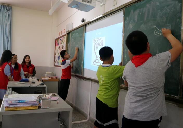 志愿者分成三个小队,分别进行了感恩教育课、卫生清洁教育课、书法绘画课的讲授。她们用生动形象的PPT为孩子们开启了一次特殊而有意义的课堂。感恩教育课上,孩子们背诵《游子吟》,讲述刚过去的母亲节为母亲做的事。志愿者巧设“我想对父母说”环节,让孩子们在活动中学会感恩;卫生清洁课上,开展了“爱清洁,讲卫生”主题班会教育活动,介绍了路边摊和辣条等三无产品的危害。随后,进行了卫生清洁知识趣味抢答,气氛融洽和谐,孩子们在增长知识的同时又学会了保护自己;书法绘画课上,志愿者为孩子们讲解了中国书法的成就造诣,再用听写汉字、用指定物品画画、趣味画图猜字游戏的方式,培养孩子们的书法绘画能力和爱国情怀。课堂上,孩子们和志愿者积极互动,大家一起度过了一个美好的下午时光。