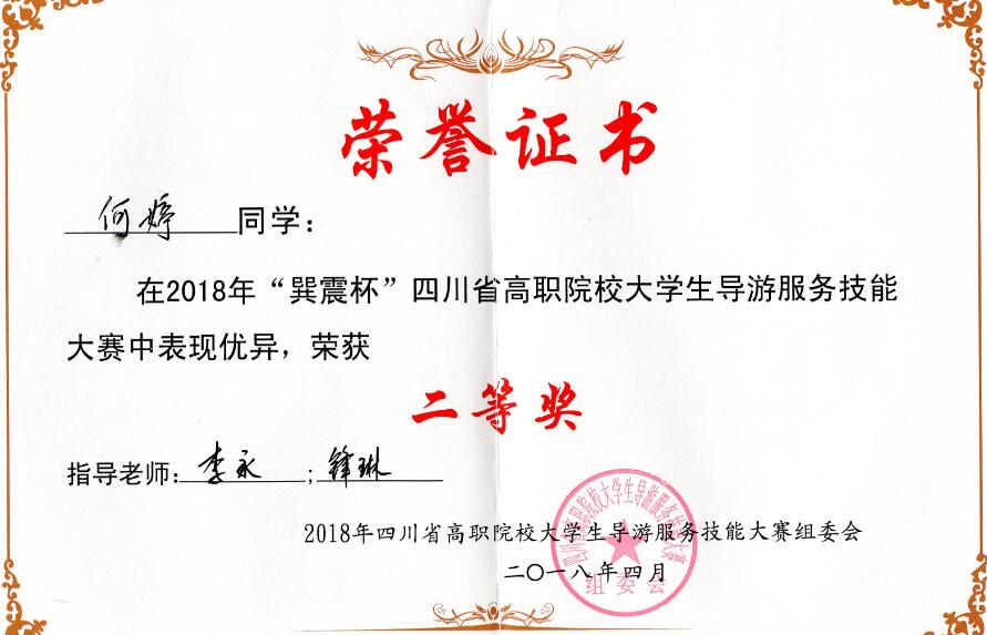 【本网讯】4月13-14日,2018年“巽震杯”四川省高职院校大学生导游服务技能大赛举行,我院旅游经济管理系指导教师高桃银、锋琳以及3名学生参加了此次比赛。通过激烈的角逐,旅游管理专业2016级选手何婷在比赛中表现优异,获得了大赛的二等奖。
