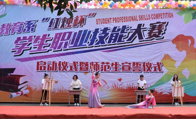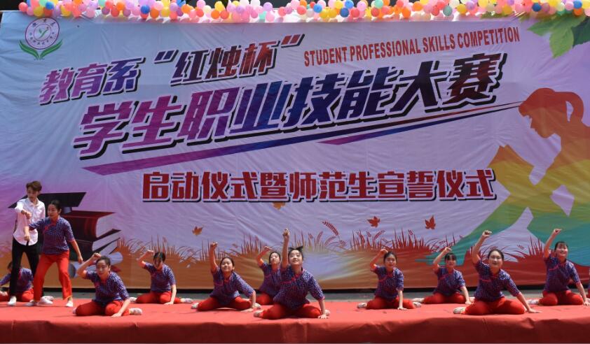 活动由教育系黄婧和颜菁同学担任主持。异域风情舞蹈《掀起你的盖头来》拉开了本次活动的帷幕。系主任孙舫南老师为本次活动致辞,随即学生职业技能展示节目汇演正式开始。合唱《时间都去哪儿了》让我们感受到了一份至纯至爱的人间亲情;古风舞《大鱼》让我们再次体验了古典文化的魅力;歌曲《最美的期待》让人满怀着对教师的众多期待;手语表演《我是一名教师》和情景舞蹈《山村支教》最让人印象深刻,同学们手语与朗诵结合的表演以及无声的舞蹈让大家深深地体会到,教师是学生心灵家园的营造者,教育是心灵与心灵的交流,教师的爱,对学生来说是一种巨大的动力。学生职业技能展示结束后,系党支部书记高运荣老师号召同学们积极参与到职业技能大赛中,并宣布教育系第一届“红烛杯”学生职业技能大赛正式开幕。瞬间礼花绽放。
