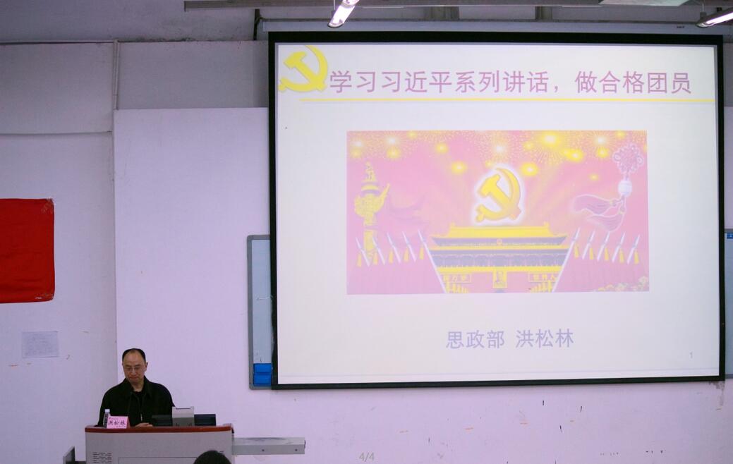 大会结束后,培训班课程正式开始。第一讲是由学院思想政治理论课教学部副主任洪松林副教授带来的题为《学习总书记讲话 做合格共青团员》的团课。洪松林副教授从实现中华民族伟大复兴的中国梦、高举中国特色社会主义伟大旗帜是实现中国梦的必由之路、治国理政总方略——“四个全面”战略布局、践行发展新理念引领发展四条主线深入解读了习总书记系列讲话精神,并结合丰富的历史实例讲述了青年是民族的希望,青年在学习工作中要始终坚持践行核心价值观,要通过坚定理想信念,勤勉求学、立志修德,锻炼品格、担当奉献,求实创新、艰苦奋斗,奋发有为四个途径为实现中国梦而努力。