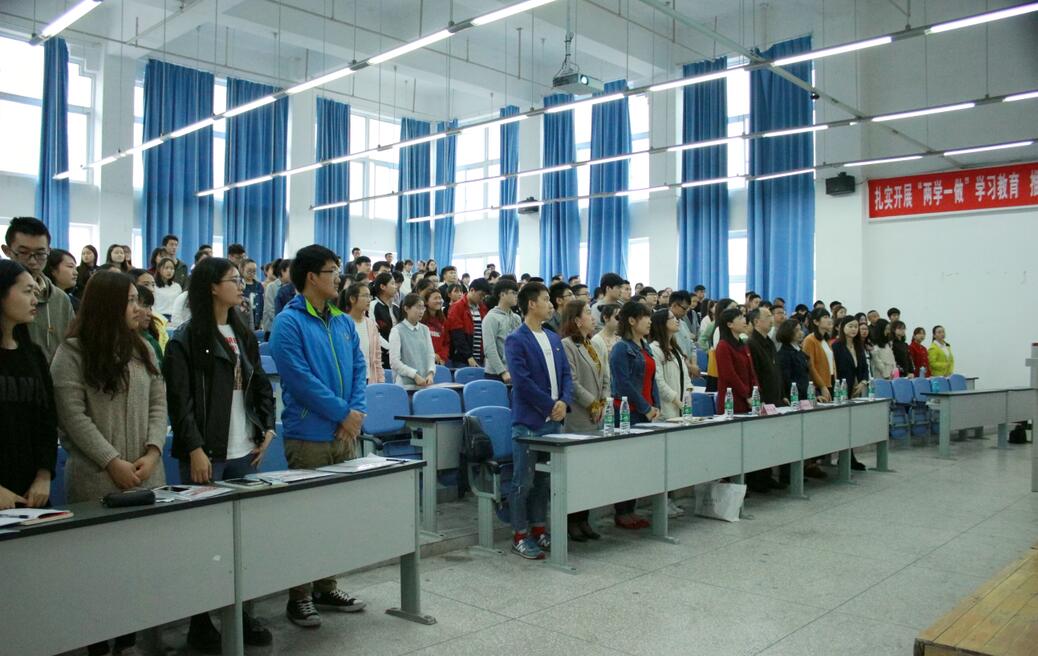 【本网讯】为进一步在全院共青团员中深入开展“一学一做”教育实践活动,4月25日下午2:30,以“学习总书记讲话 做合格共青团员”为主题的PP电子游戏网站第三期“一学一做”主题团校培训班开班典礼在青年路校区图阶101举行。学院团委书记刘永恩,思政部副主任洪松林,各系团总支书记、副书记,团委老师出席大会。全院145位优秀团干部代表和50位入团发展对象参会。会议由院学生主席周钰琳主持。
