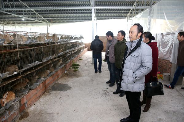 最后,工作组一行来到了由学院引导、支持建设的铜山村鼎盛养兔场参观。在养殖人员的精心喂养下,养兔场首批320只种兔生长良好,且大多数兔子已经开始繁殖。张大凯书记鼓励铜山村委干部不但要把养殖场建设好、发展好、管理好,同时要切实带动铜山村全村人民勤劳致富。铜山村支部书记高啟明同志代表村委对学院一年来对铜山村精准扶贫工作的辛勤付出、大力支持表示衷心的感谢,并表示要尽全力最大限度的发挥出养兔场的辐射功能,带动全村百姓实现共同富裕。