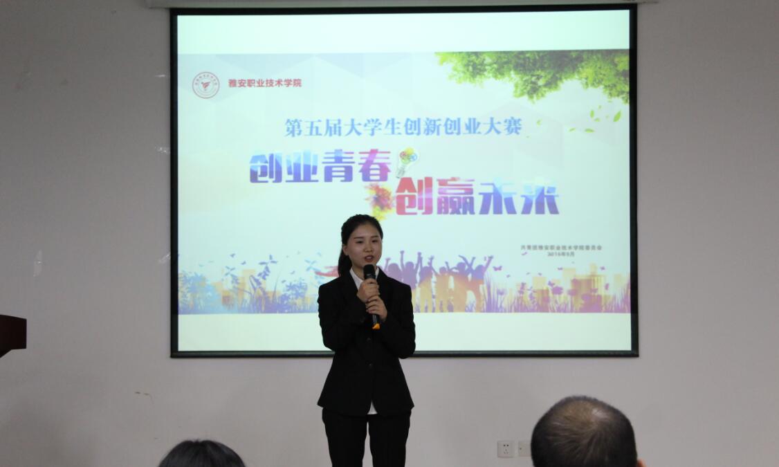 【本网讯】9月8日下午,由院团委主办的学院第五届大学生创新创业大赛在青年路校区图书综合楼903举行。学院宣传统战部部长、国家高级职业指导师郭英才,院团委书记高运荣,招生就业处副处长、SYB创业培训师、雅安市大学生创新创业专家导师团成员吴洁,创新创业就业指导老师王丽,大学生就业指导老师王坤蓉担任此次大赛评委。各系团总支书记、副书记及16支创业团队参加了比赛。