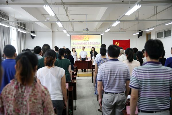 【本网讯】6月30日下午,学院党政班子成员、在职教职工党员代表、离退休党员代表、新党员代表90余人佩戴着党徽,在青年路校区图书综合楼903会议室隆重集会,庆祝建党94周年,共同缅怀党的光荣历史,弘扬党的优良传统,并通过新党员宣誓、老党员重温誓词、表彰先进党员等活动,进一步加强党员党性修养,践行 “三严三实”要求,坚定理想信念,夯实贯彻落实“四个全面”战略的思想基础,以推动学院建设发展。党委副书记、院长石静主持大会。