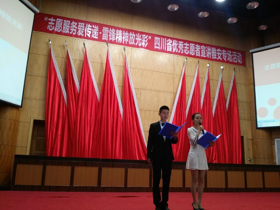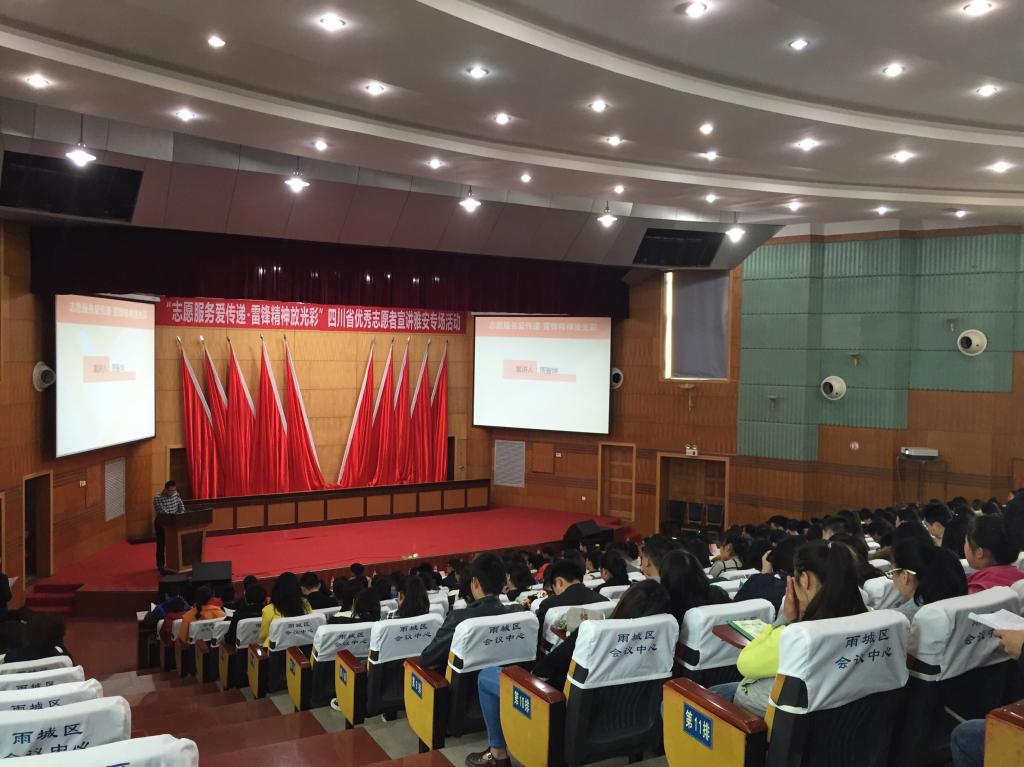 “志愿服务爱传递,雷锋精神放光彩”,4月9日上午,由省文明办、省志愿服务基金会、省学雷锋爱心联盟和市文明办、市学雷锋志愿服务总队、市学雷锋爱心联盟联合主办,团市委、团区委承办的四川优秀志愿者宣讲雅安专场活动在雨城区政府阶梯会议室举行,我院70余名志愿者参加了本次活动。