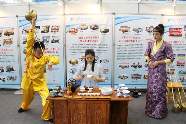 我院对参加本次教学成果展高度重视、精心策划和组织,除制作精美的办学成果展板、画册和悬挂在展区门楣上“PP电子游戏网站欢迎您”温馨的条幅外,在校内挑选了眼视光技术专业、医学检验技术专业、旅游管理专业、学前教育专业四个专业的学生赴现场进行眼镜清洗、镜架矫正,血型、血糖测定,茶艺茶技展示,手工作品展示等各具专业特色的技能秀。品一杯藏族同学亲手煮沏的藏茶、观看规范兼具欣赏性的技能展示,享受着同学们热情细心的技能服务,众多参展者在我院展区驻足、欣赏、点头称赞,不少来自其他院校同类专业的同学们也纷纷前来交流、互相切磋技艺。尤其值得一提的是,旅游管理专业同学带来的“长嘴铜壶茶技——中国蒙顶山龙行十八式”表演还登上了举办方设置的舞台,翻转腾挪、提壶把盏间展现的独特景观赢得了观众们的肯定和掌声。