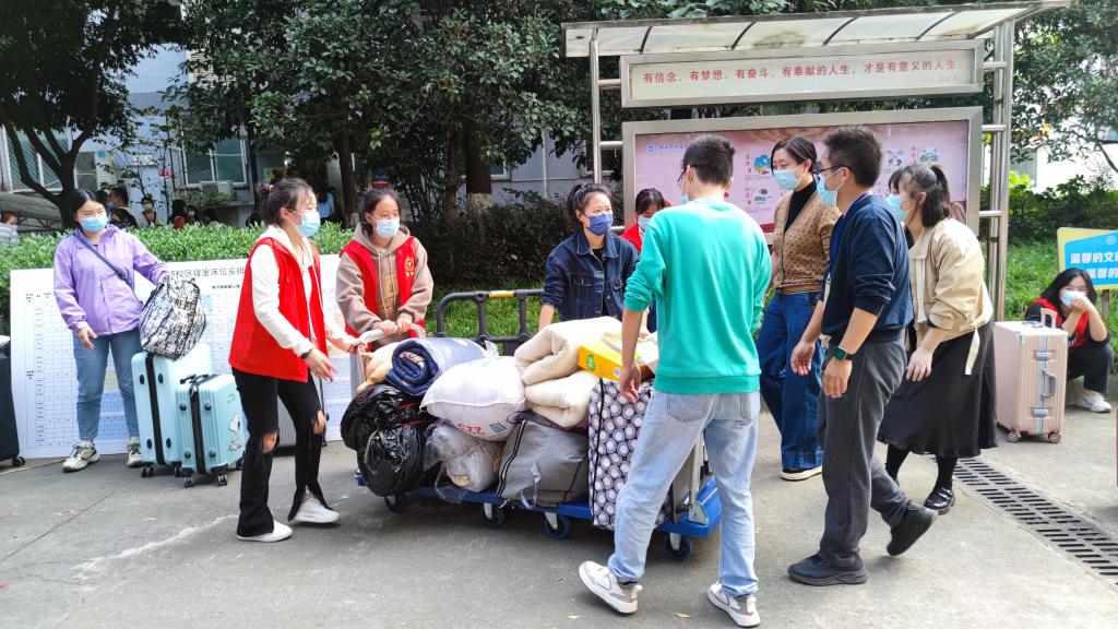 人手不足,包裹突增。为了更好地完成迎新工作,学院在育才路校区召集了青年志愿者协助运输、分发行李。青年志愿者为新生返校工作增添了一抹青春亮色。