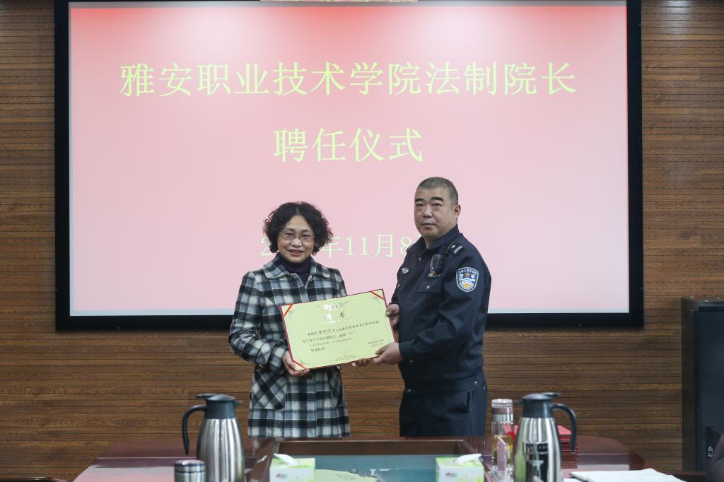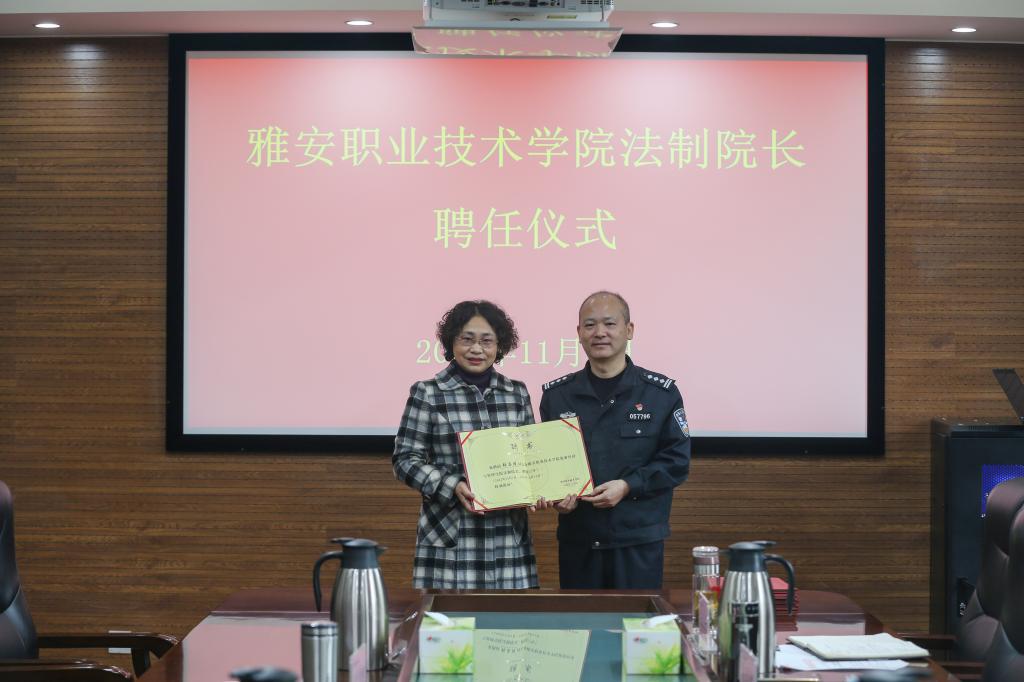 为推进“依法治校”和“平安校园”创建工作,切实加强学院普法教育,增强广大师生的法治观念。11月8日,“PP电子游戏网站法制校长聘任仪式”在经开区校区综合楼303会议室举行。雅安市雨城区青江派出所教导员张昌煌、经开区永兴派出所所长谢建涛、受聘民警代表、学院工会主席夏安琼以及相关职能部门、二级学院负责人、法制辅导员参加聘任仪式。学院武装部部长、保卫处处长徐维主持仪式。