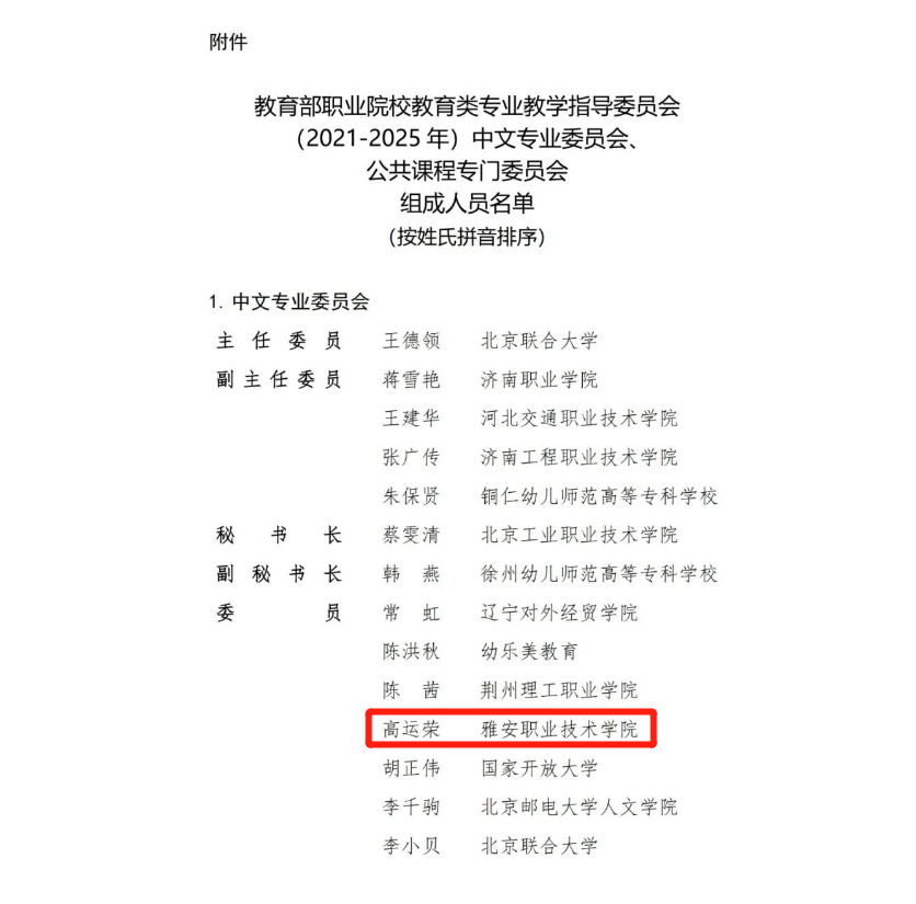 经济与管理学院直属党支部书记高运荣入选教育部职业院校教育类专业教学指导委员会中文专业委员会委员。