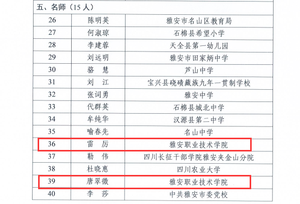 为加快培养造就一支转型发展、创新发展、跨越发展急需紧缺的高层次人才队伍,市委人才办开展2022年“雅州百千英才计划”评选工作,经组织推荐、综合评选、现场答辩,学院3人成功入选2022年“雅州百千英才计划”。教师雷厉、唐翠微入选“雅州名师”,教师王飞入选“雅州菁英”。
