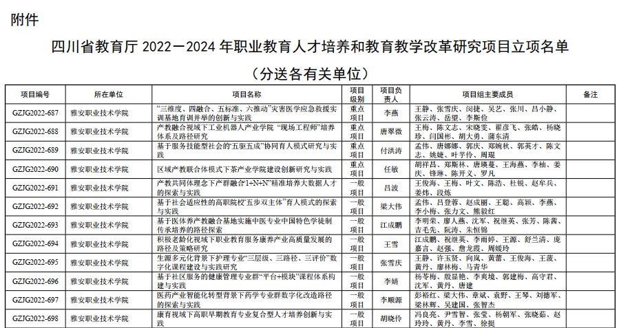 近日,四川省教育厅发布了《四川省教育厅关于公布2022-2024年职业教育人才培养和教育教学改革研究项目立项名单的通知》(川教函【2023】100号),学院19个项目获批立项,其中重点项目4项、一般项目15项,获批项目数量和质量均创历史新高。