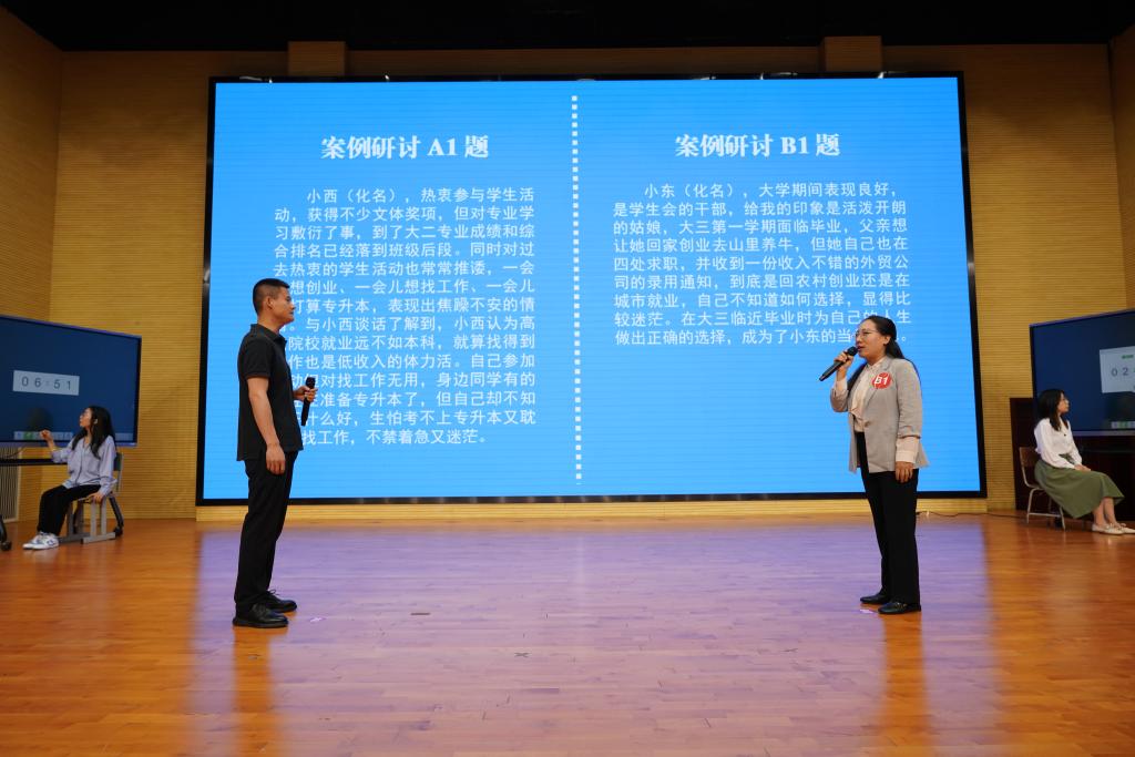 本次比赛本着“以赛促学、以赛带练”理念,前期经过各二级学院选拔角逐,共有14名辅导员进入决赛,决赛阶段分为“案例研讨”和“谈心谈话”两个环节。案例研讨环节,参赛辅导员以互相提问和作答的方式,围绕学生学习就业、经济困难、人际交往及情感等方面的典型案例进行判断与研讨,全面展示了学院辅导员的理论素养和专业素质。谈心谈话环节,通过情景再现的形式,参赛辅导员与学生进行面对面深入交流,谈话内容涉及思想政治教育、日常管理、心理健康等多个方面,针对学生具体问题,辅导员认真倾听、全面分析、合理引导,充分体现了学院辅导员的精神风貌。