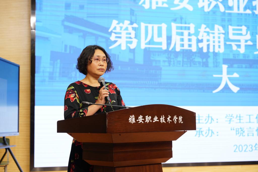 为深入学习贯彻习近平新时代中国特色社会主义思想,全面贯彻落实全国全省高校思想政治工作会议精神,落实《普通高等学校辅导员队伍建设规定》要求,进一步加强和提高学院辅导员理论水平、职业能力和专业素养,4月17日下午,学院第四届辅导员素质能力大赛决赛在经开区校区聚雅厅举行,学院工会主席夏安琼出席活动并讲话,各二级学院党总支(直属党支部)书记、副书记,全体辅导员、学生管理干事,新教师代表、学生代表共200余人到场观摩。学生处处长姚婕、团委书记叶芋伶、人事处副处长洪松林、招生就业处副处长罗翠琼、马克思主义学院副院长任虹静担任此次决赛评委。