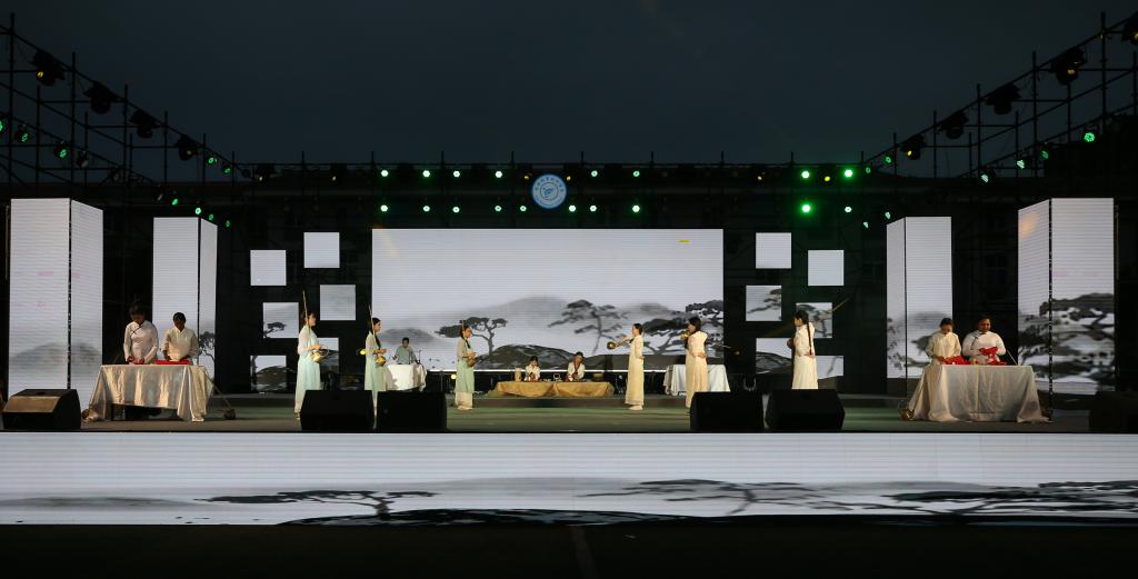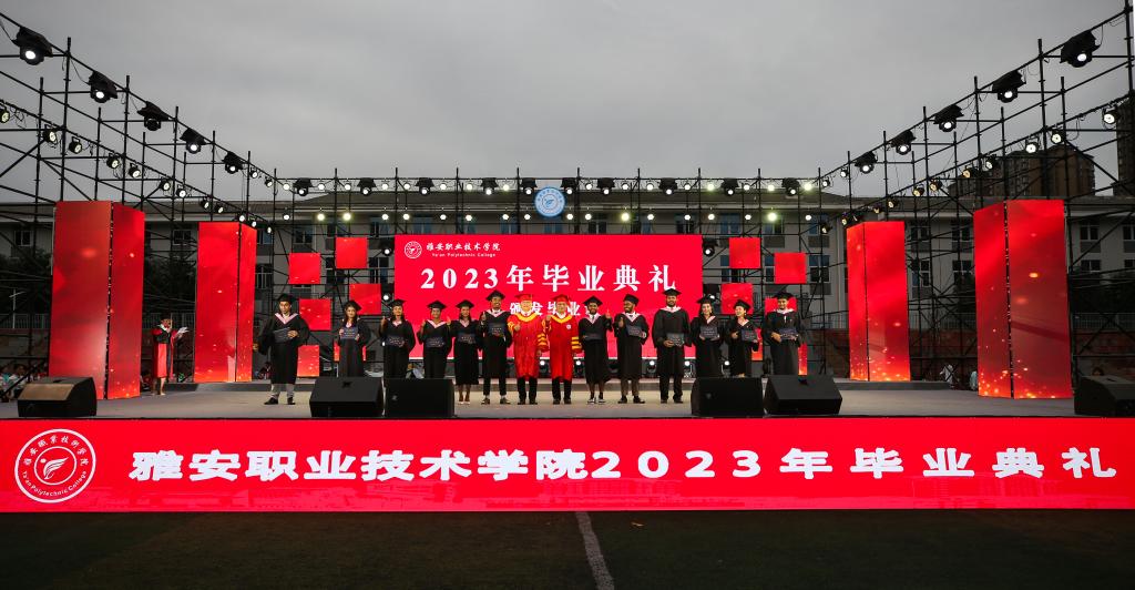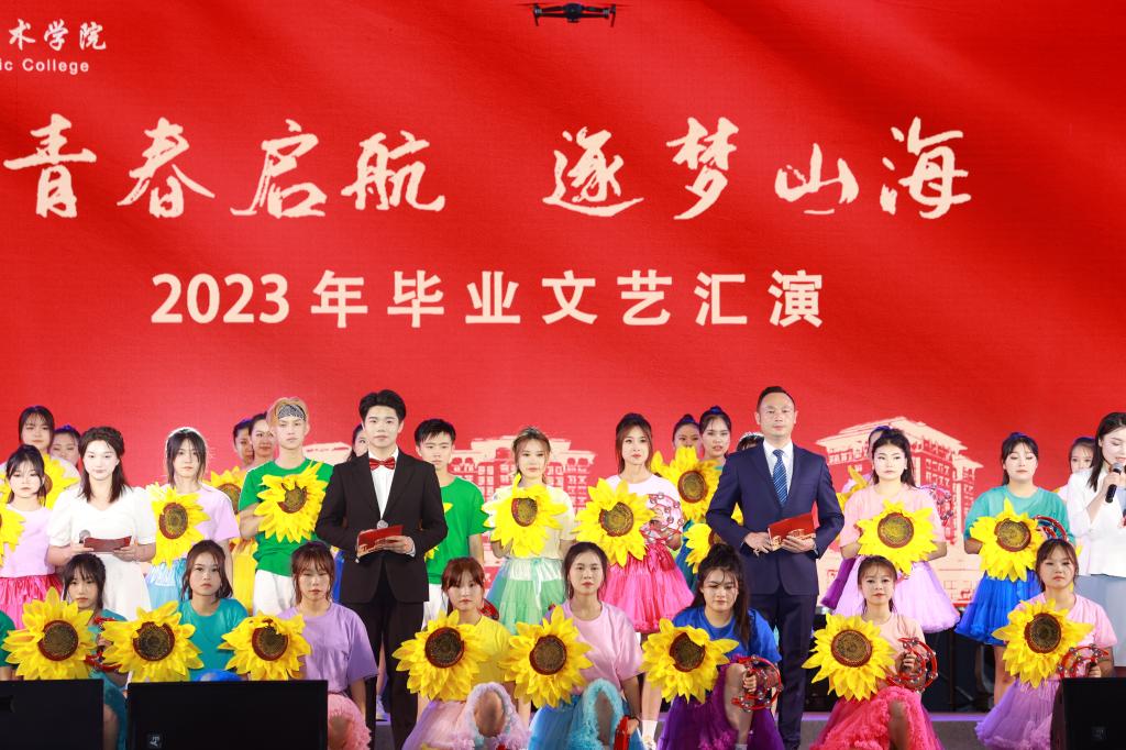 毕业典礼结束后,随着四位主持人闪亮登场,以“青春启航,逐梦山海”为主题的文艺汇演拉开帷幕,演出分为“意气华年,相期共许凌云志”“厚积薄发,青春奋斗在雅职”和“四海比邻,他日归来仍少年”三个篇章。涵盖了歌曲、舞蹈、情景剧、朗诵、乐队演唱、茶艺表演等10个精彩节目。师生以优雅青春的舞姿,美妙的歌声,深情的话语讲述雅职的故事。表演期间,毕业生代表为宿管、保洁、门卫、食堂等后勤保障的工作人员献花致意,感谢他们辛勤付出和无私奉献。