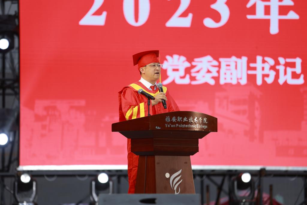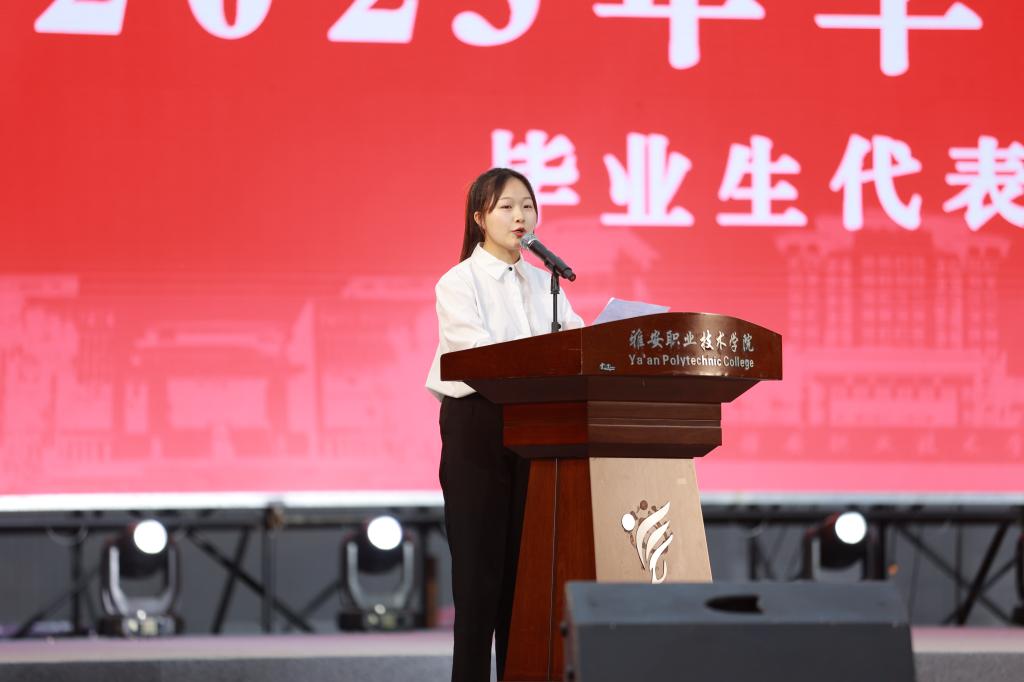 毕业生代表舒梦代表全体毕业生向母校和老师们表达了感恩、祝福之情,表示定会牢记“厚德、重能、求是、创新”的雅职校训,砥砺前行,立志做有理想、敢担当、能吃苦、肯奋斗的新时代好青年。