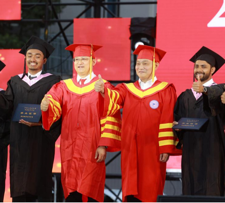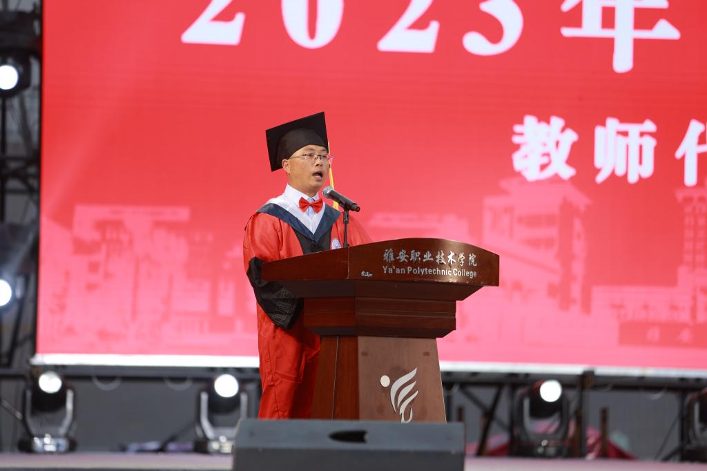 教师代表刘德军代表全体教师满怀深情地嘱托毕业学子,希望同学们要心怀“国之大者”,怀抱梦想又脚踏实地,敢想敢为又善作善成,要自信和自强,也要常常自醒和自勉,不可好高骛远、不可以事小而不为,要脚踏实地,担负起对家庭和对社会的责任。